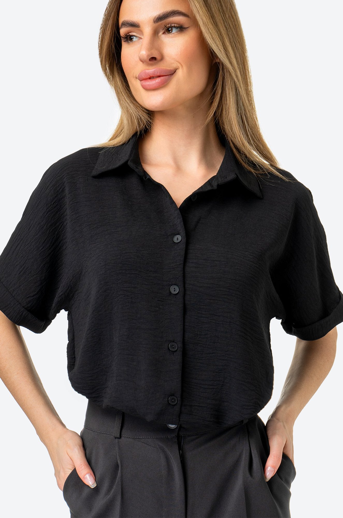 Забудьте про глажку! Рубашка для женщин выполнена из ткани жатка, которая не мнется. Благодаря своим свойствам черная рубашка красиво драпируется на теле, создавая воздушные складки и небрежные линии.