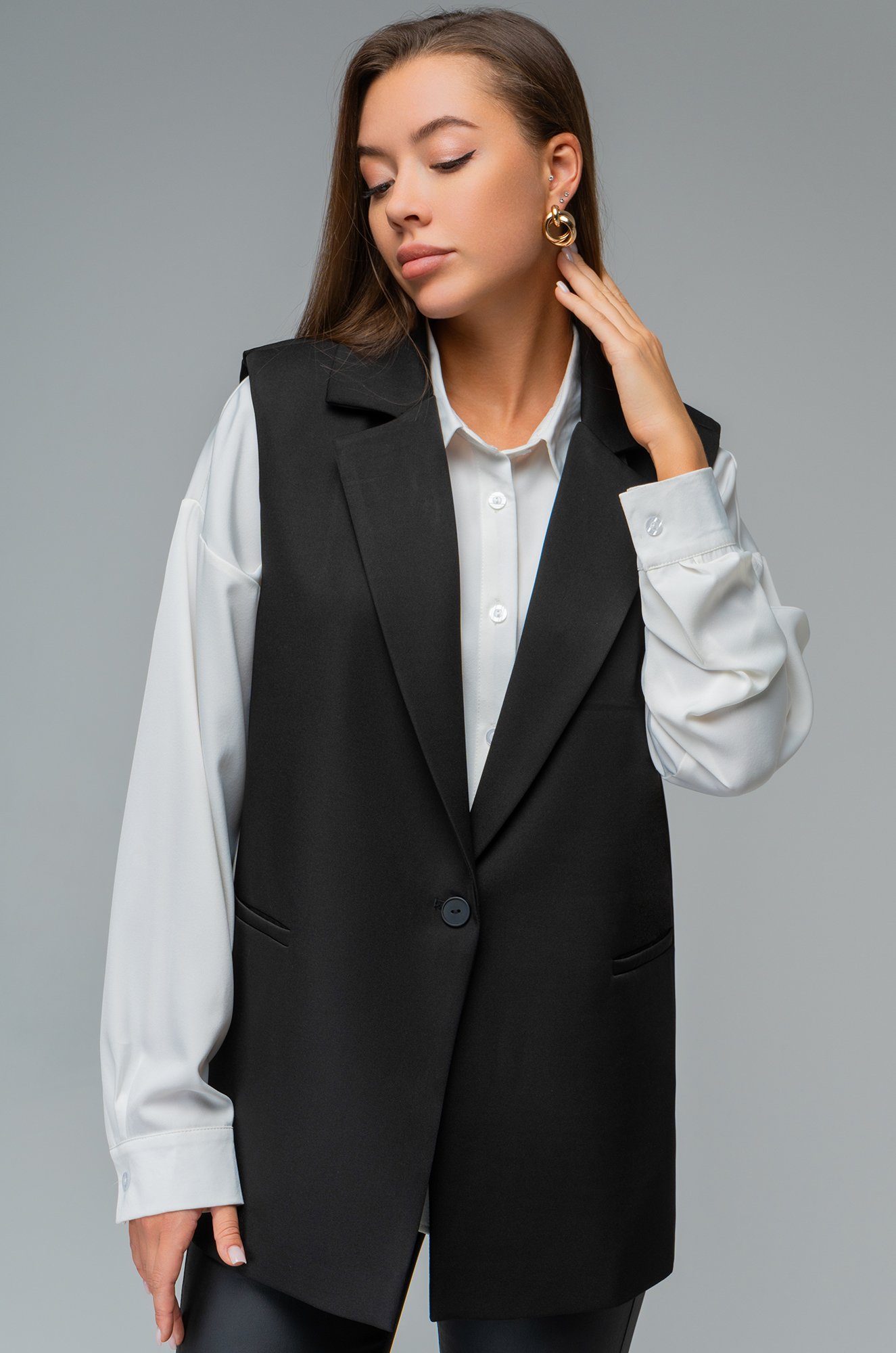 Длинная жилетка выполнена из костюмной ткани, которая делает ее идеальной для весны и осени. Благодаря добавлению полиэстера и вискозы она не вытягивается после частых стирок. Черный жилет имеет легкую и приятную к телу подкладку.
