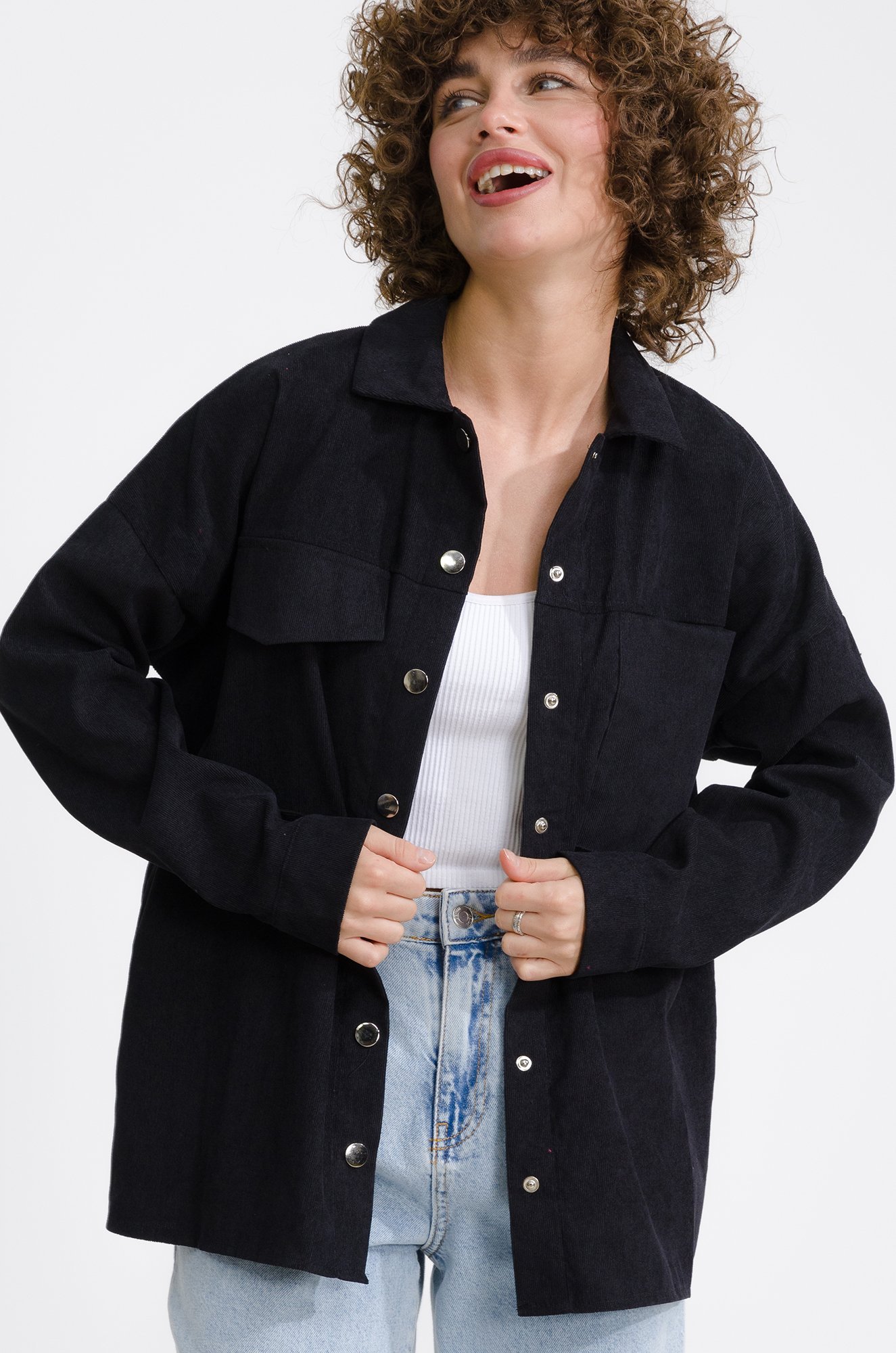 Женская рубашка оверсайз из мягкой ткани вельвет – один из популярных трендов последних лет. Свободный крой удлиненной рубашки подарит уют и комфорт, а большие карманы на груди и металлические пуговицы кнопки добавят стильную изюминку в образ. Черная вельветовая рубашка для женщин идеальна для прохладной весны и зябкой осени.