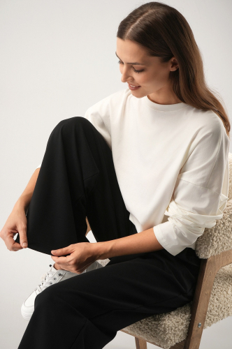 Прямые широкие штаны с высокой талией создают аккуратный силуэт и позволяют чувствовать себя комфортно весь день. Классические офисные брюки станут отличным выбором на осень, для деловых встреч и повседневных образов.