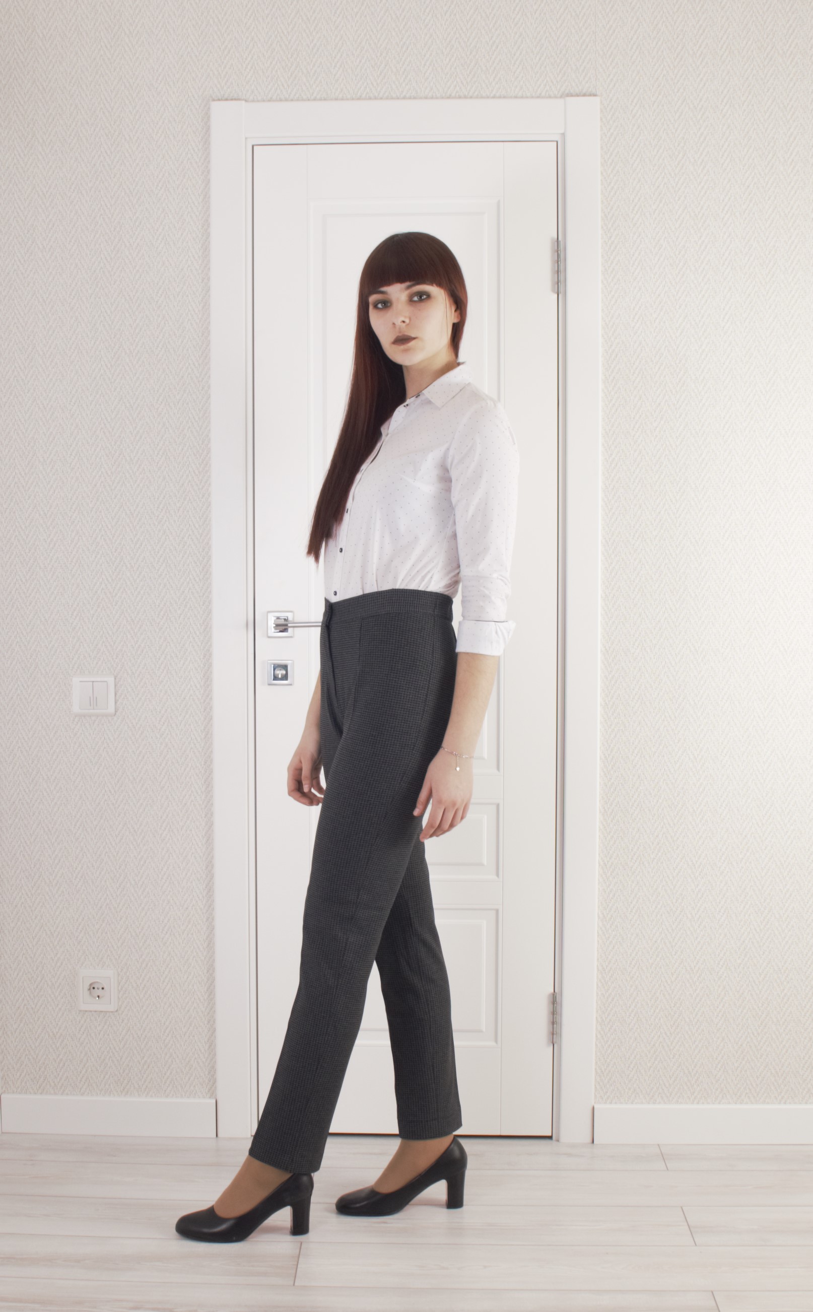 Брюки классического кроя, зауженные книзу, с разрезиком.Застежка на молнии и пуговке.На поясе сзади-резинка.Длина 100 см.Ткань- мягкая костюмная серо-черная клетка.Состав Вискоза 65%, Полиэстер 30%, Эластан 5%.