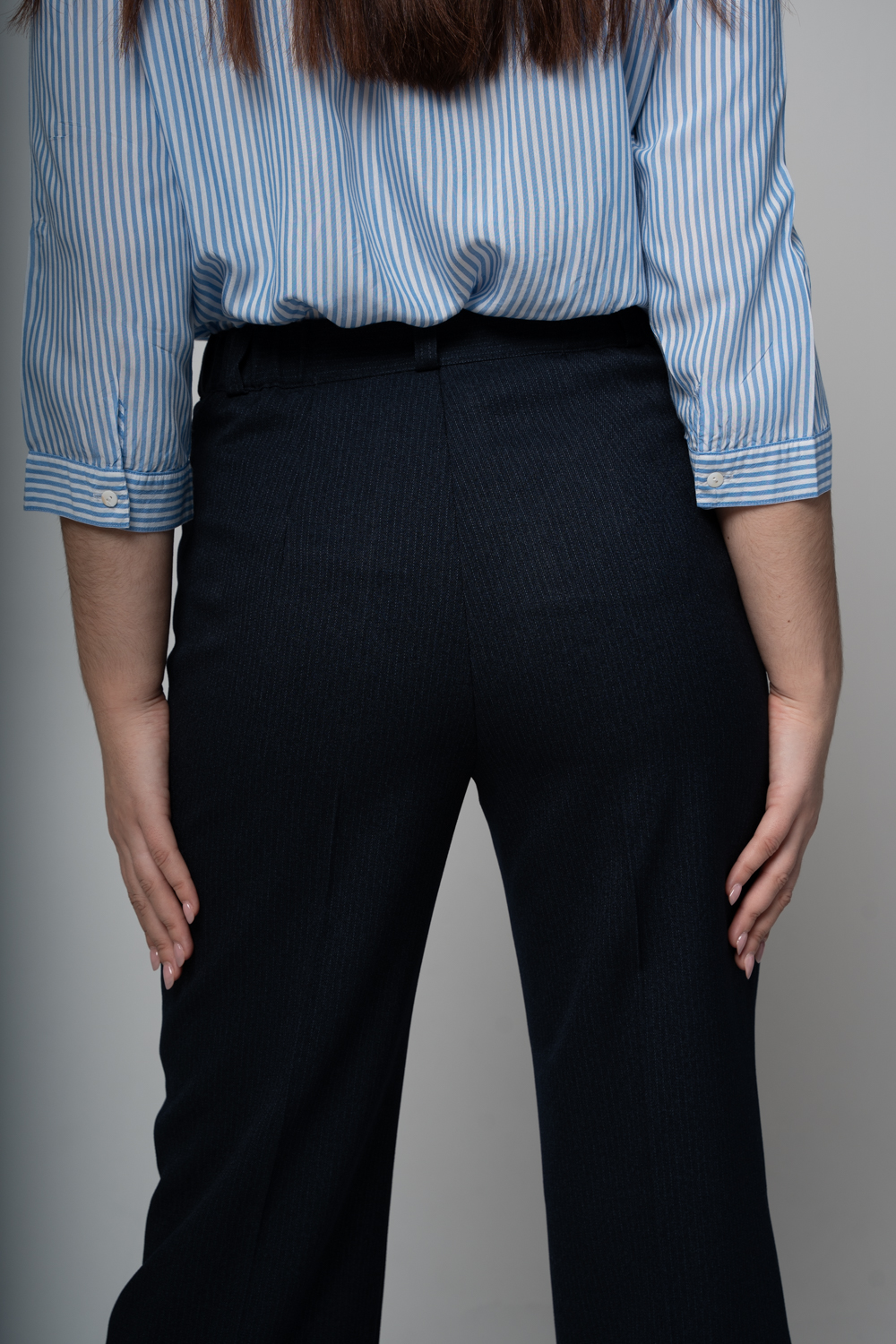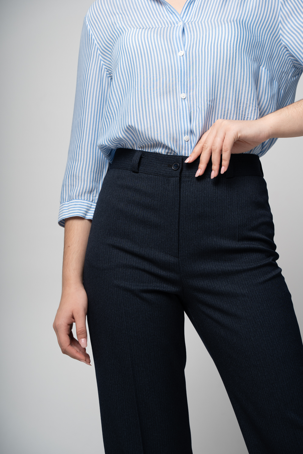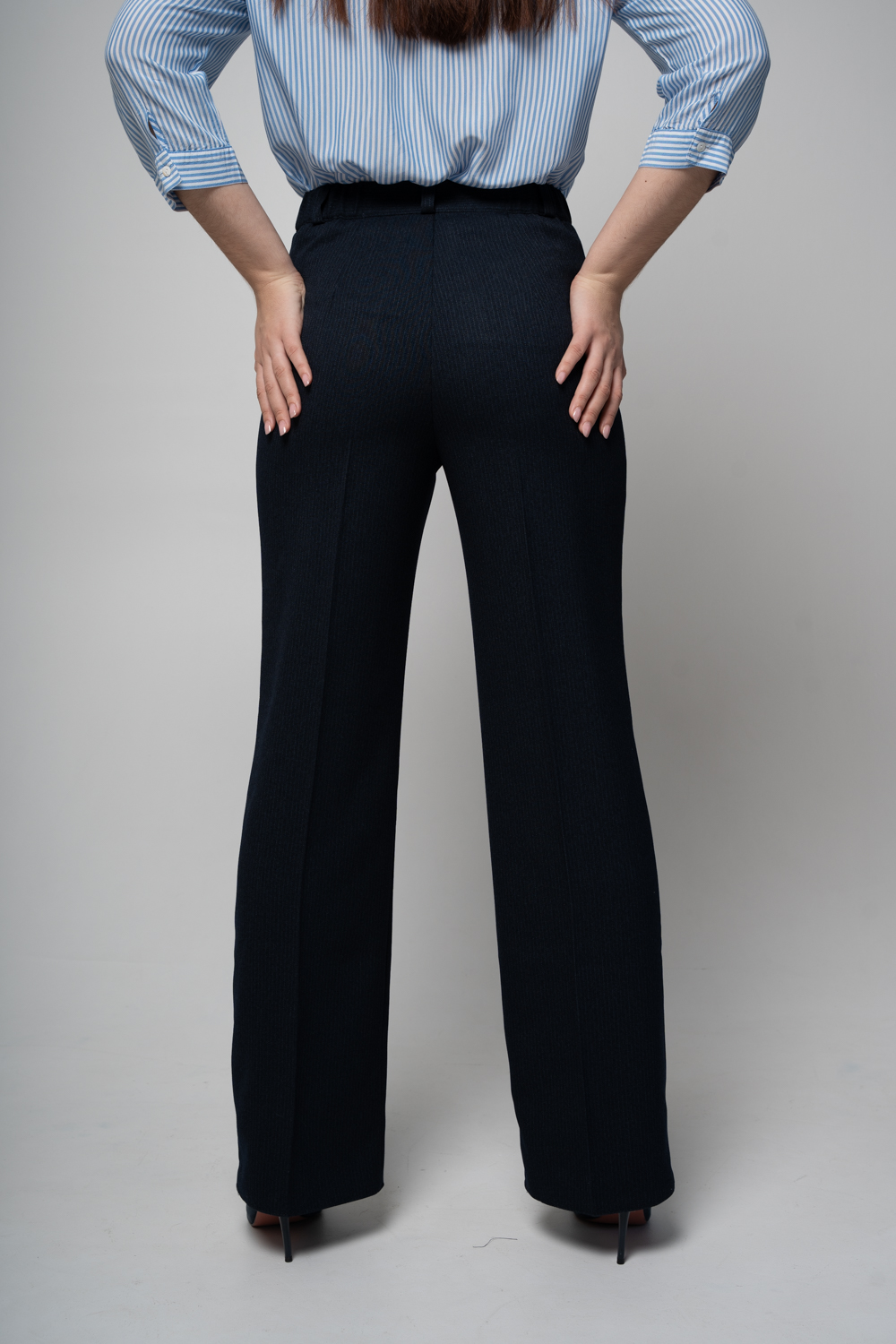 Брюки прямого покроя, верх на поясе шириной 4 см, сбоку на резинке, застёжка на молнии с пуговкой.Имеются шлевки для ремня.Ткань: белая тонкая полоска на темно-синем фоне.Состав ткани: Полиэстер 30%, Вискоза 65%. Эластан 5%.Длина 110 см по боковому шву и 86 см по внутреннему.Ширина внизу 48 см.Замеры соответствуют 44 размеру.