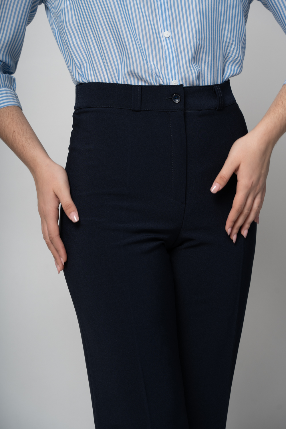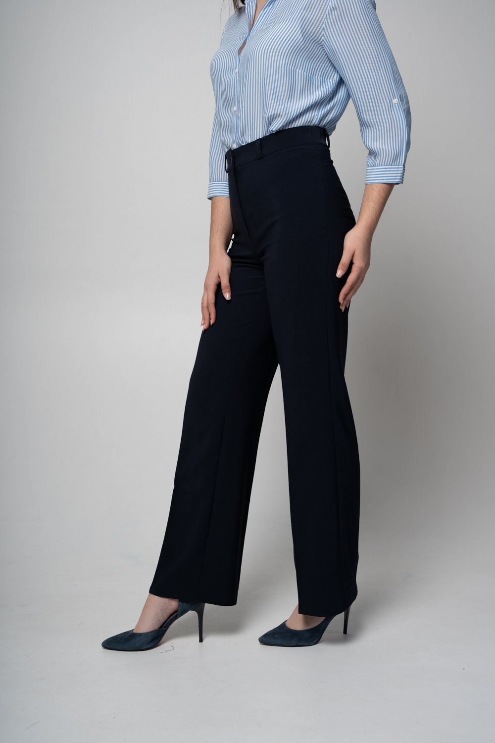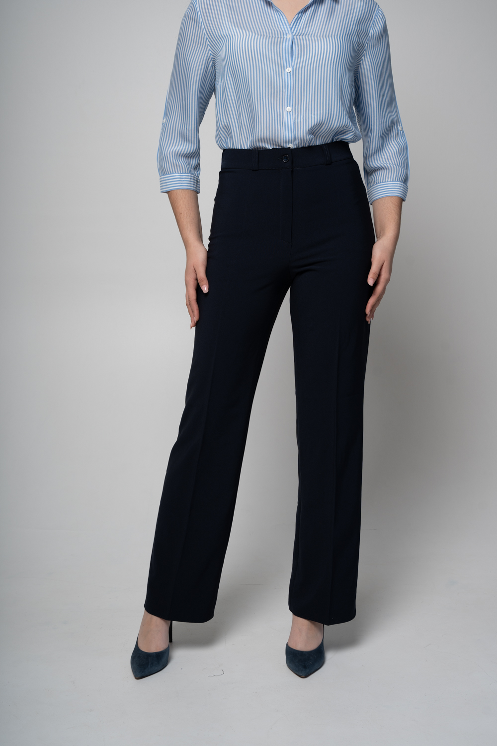 Брюки прямого покроя, верх на поясе, сбоку на резинке, застёжка на молнии с пуговкой.Имеются шлевки для ремня.Состав ткани: Полиэстер 65%, Вискоза 30%. Эластан 5%.Длина 110 см