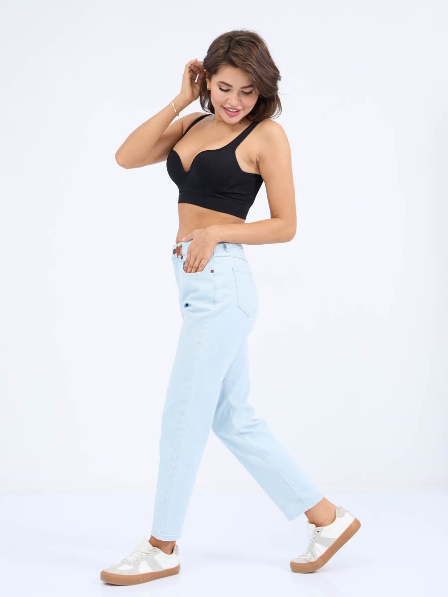 Женские модные джинсы с пятью карманами. Посадка Mom fit (высокая талия), свободные в бедре и зауженные к низу, укороченной длины.  Застежка на молнию. Выполнены из слабоэластичной ткани denim comfort stretch.  Классическая светлая стирка "stone wash"с  отбеливанием.