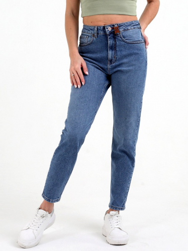 Женские модные джинсы с пятью карманами. Посадка Mom fit (высокая талия), свободные в бедре и зауженные к низу, укороченной длины.  Застежка на молнию. Выполнены из слабоэластичной ткани denim comfort stretch. Светлая  стирка с потёртостями спереди и сзади. Параметры указаны для размера 28. Длина внутреннего шва - 72 см.
