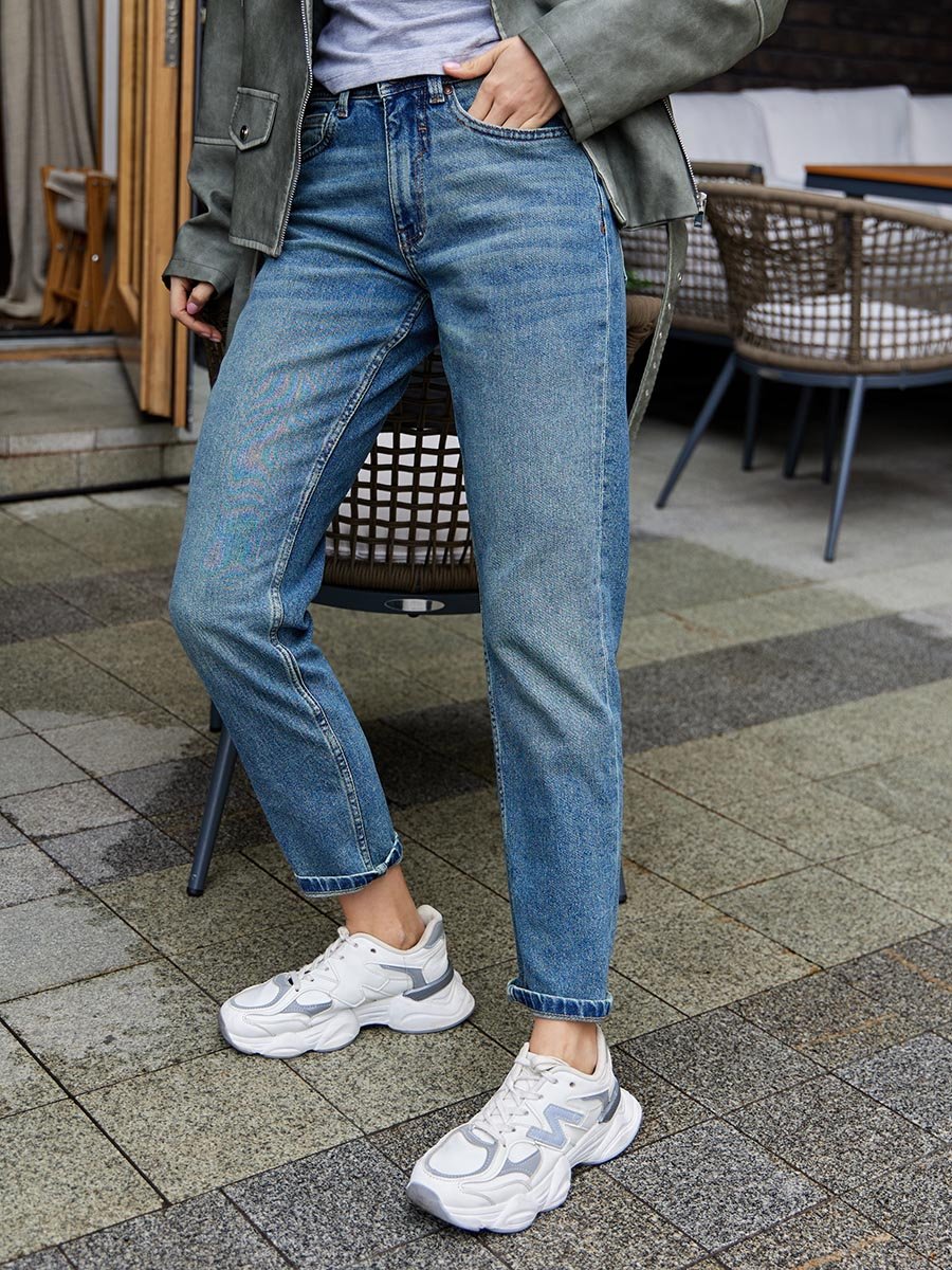 Женские  джинсы с пятью карманами. Посадка Boyfriend fit. Для улучшения посадки по талии сделан подкройной пояс из 2-х частей. Застежка на молнии. Средняя высота талии спереди и высокая сзади, зауженные к низу, укороченной длины. Боковой шов "в разутюжку" обработанный красными нитками. Выполнены из слабоэластичной ткани denim comfort stretch. Средняя стирка "stone wash".