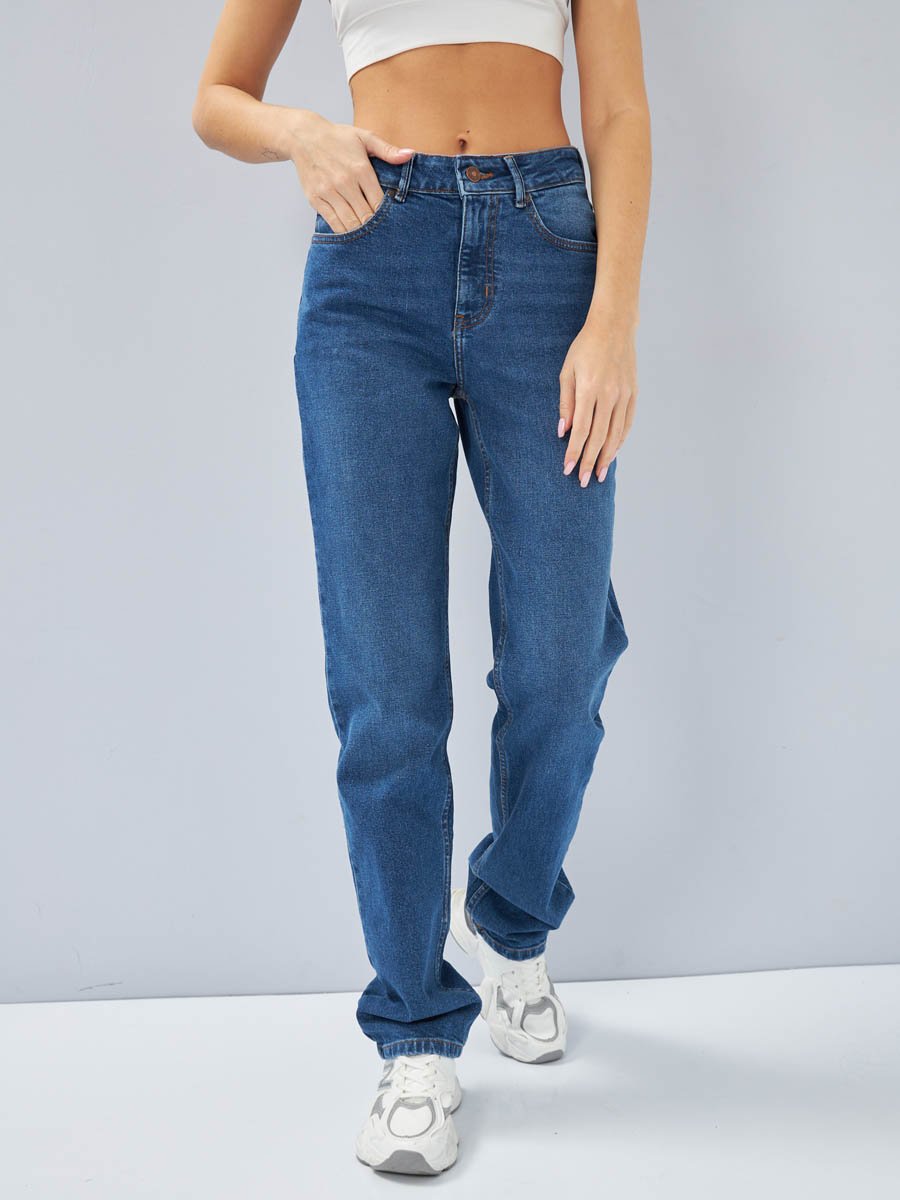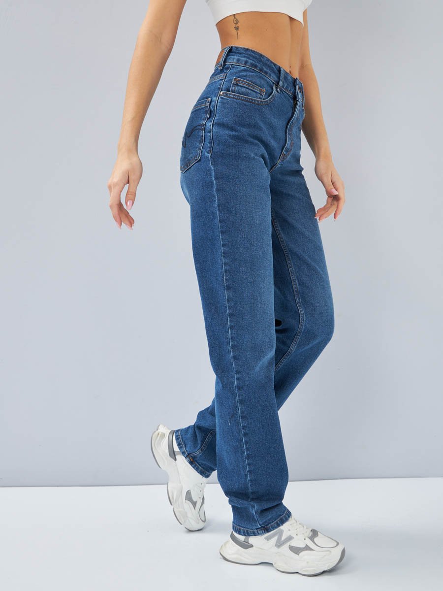 Женские классические джинсы с пятью карманами. Посадка Comfort fit (свободные по бедру). Специально завышенная талия. Для улучшения посадки по талии сделан подкройной пояс из 2-х частей. Застежка на молнии. Зауженные к низу. Выполнены из слабоэластичной ткани denim stretch. Средняя стирка со слабовыраженными потёртостями и "усами" спереди и потёртостями сзади.