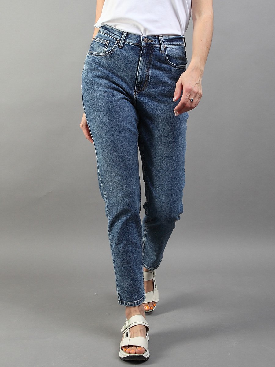 Женские классические ретро джинсы с пятью карманами с использованием лучших традиций 90-х. Посадка Mom fit, высокая талия спереди и сзади, свободные в бедре и зауженные к низу укороченной длины. Застежка на молнии. Выполнены из слабоэластичной ткани denim comfort stretch. Специальная средняя стирка  "towel wash", мраморный эффект.