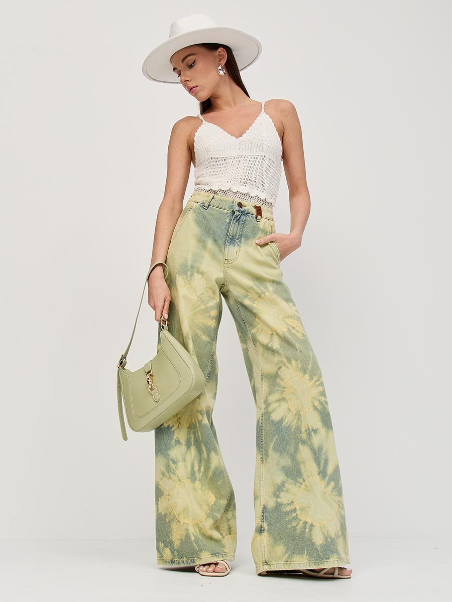 Это широкие джинсы с высокой посадкой идеально подходят для создания расслабленного, непринужденного образа. Также подходят как для повседневного ношения, так и для особых, но неформальных случаев. Изготовленные из мягкого традиционного денима, они обеспечивают полное сочетание удобства и практичности. Высокая талия с вытачками сзади для улучшения посадки пояса, карманы "хулиганы", свободные штанины сильно расширяющиеся к низу, позволяют получить утонченный силуэт и подчеркнуть особенности женской фигуры наилучшим образом и в тоже время обеспечить свободу движений. Эти джинсы с уникальным эффектом стирки по технологии "Тай-дай (Tie-dye)", т.е.способом стирки путем скручивания, складывания и заматывания изделия с целью получения уникальных хаотичных и размытых узоров и последующим эффектом подкрашивания "GET DIRTY", т.е. эффектом запачканных джинсов.