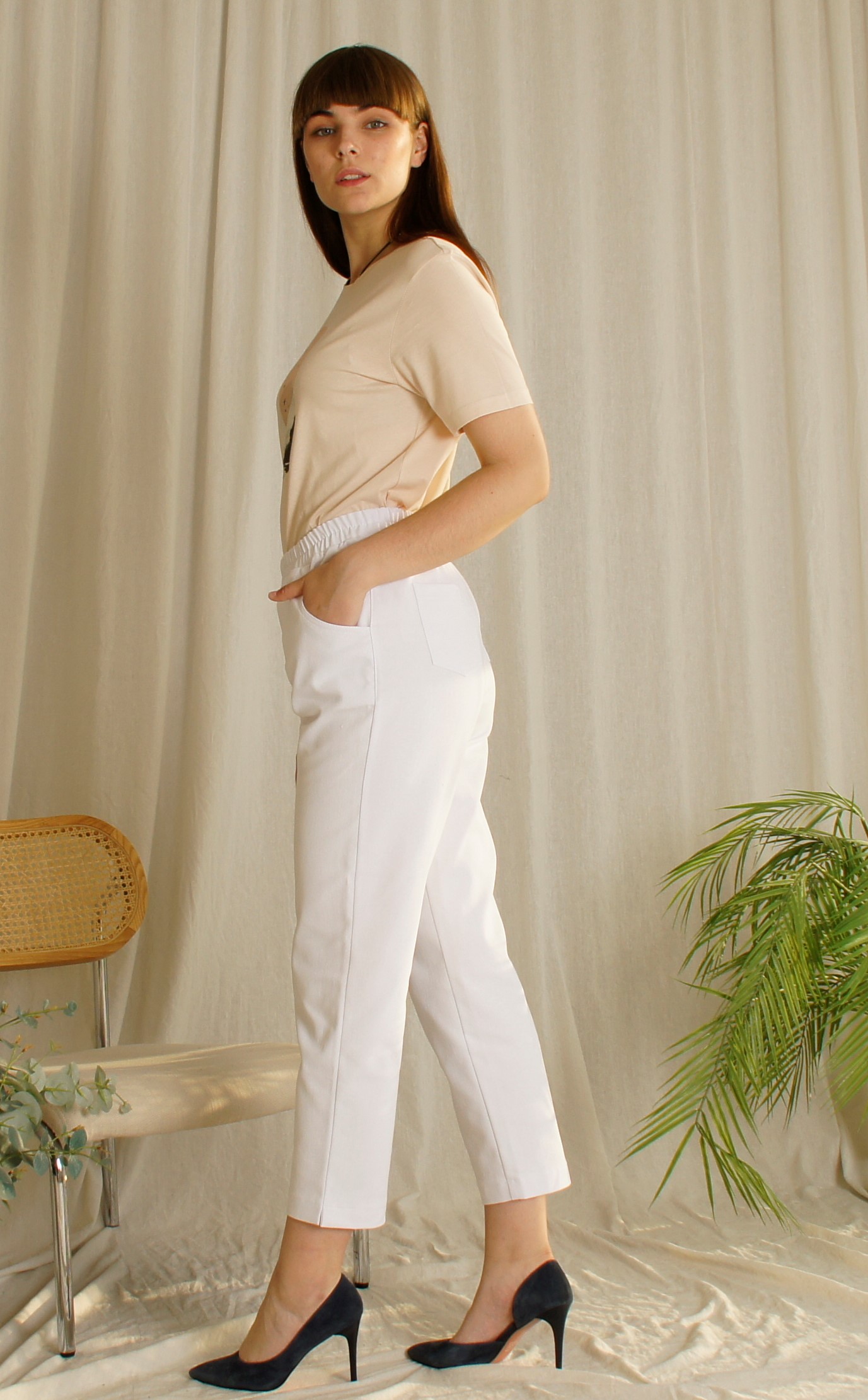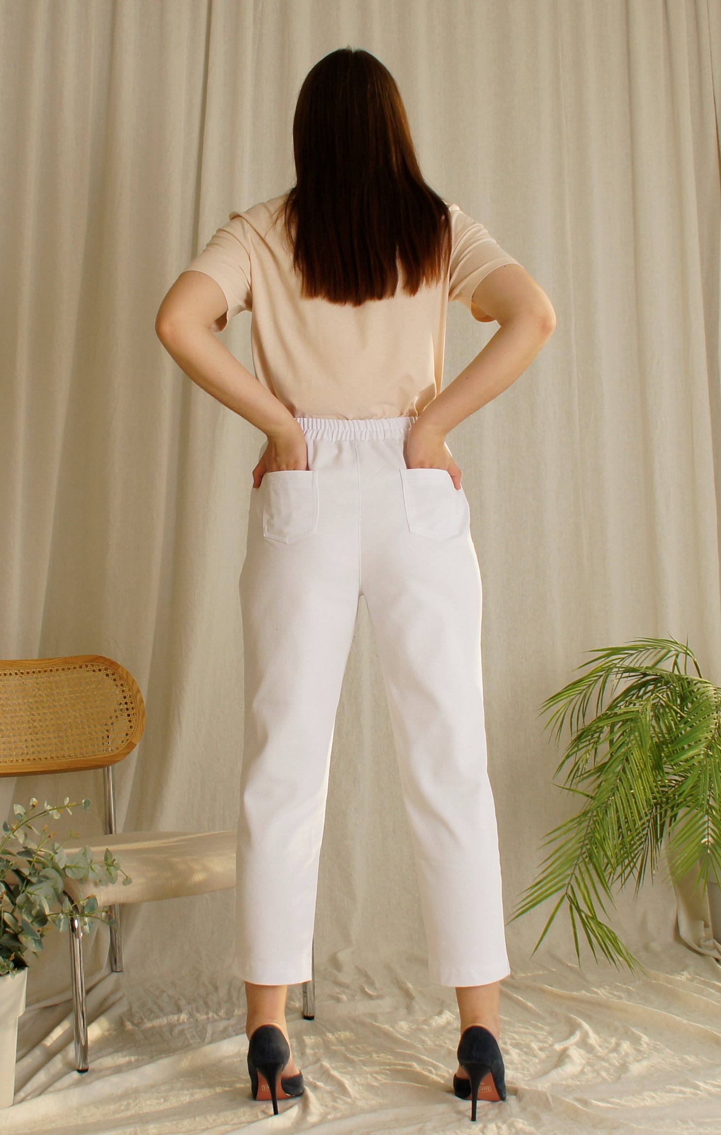 Брюки зауженные классического кроя, пояс на резинке,Передняя часть с карманами, задняя с накладными карманами. Длина 90 см по боковому шву.Состав: хлопок 95% , эластан 5%