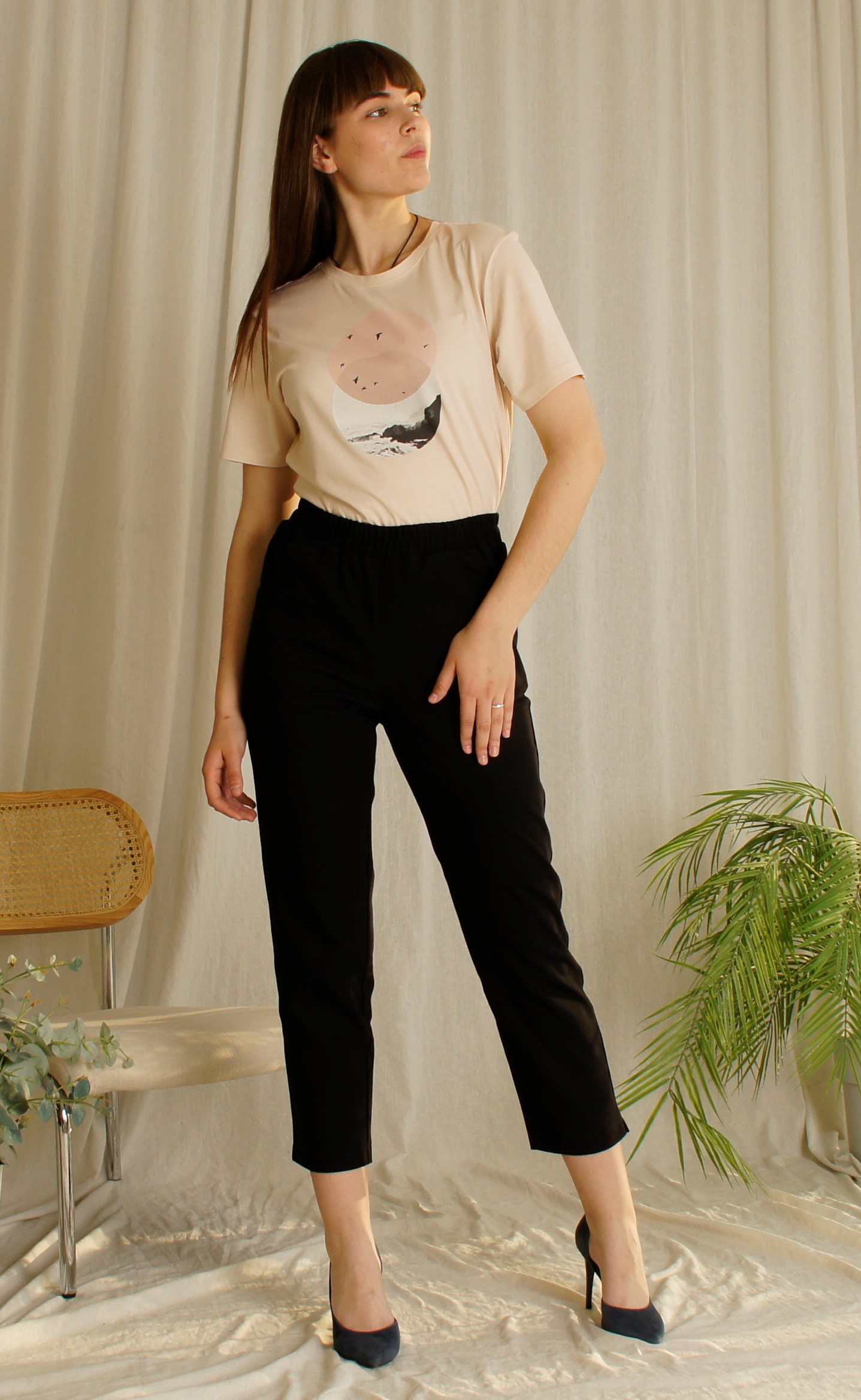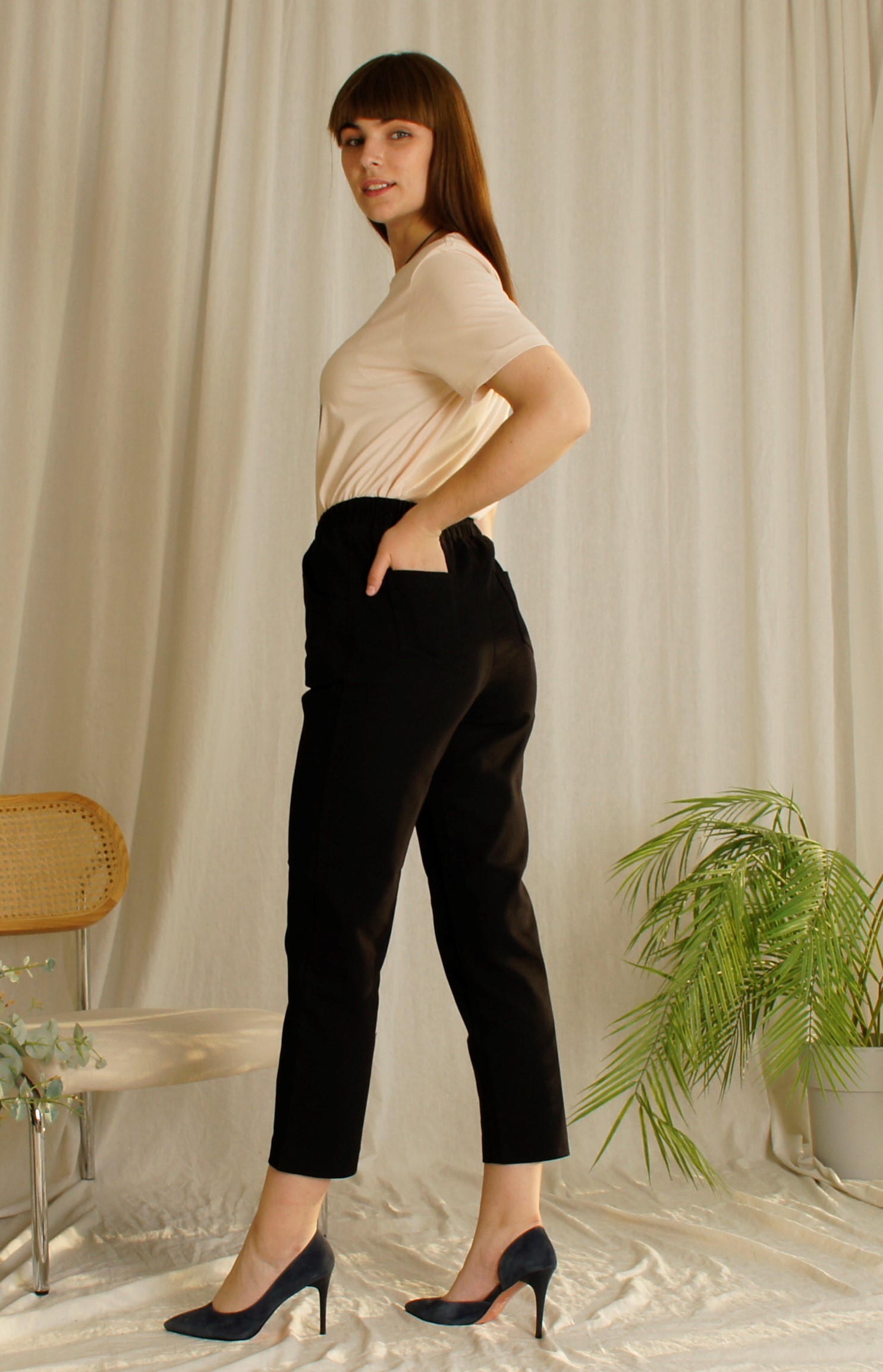 Брюки зауженные классического кроя, пояс на резинке,Передняя часть с карманами, задняя с накладными карманами. Длина 90 см по боковому шву.Состав: хлопок 95% , эластан 5%