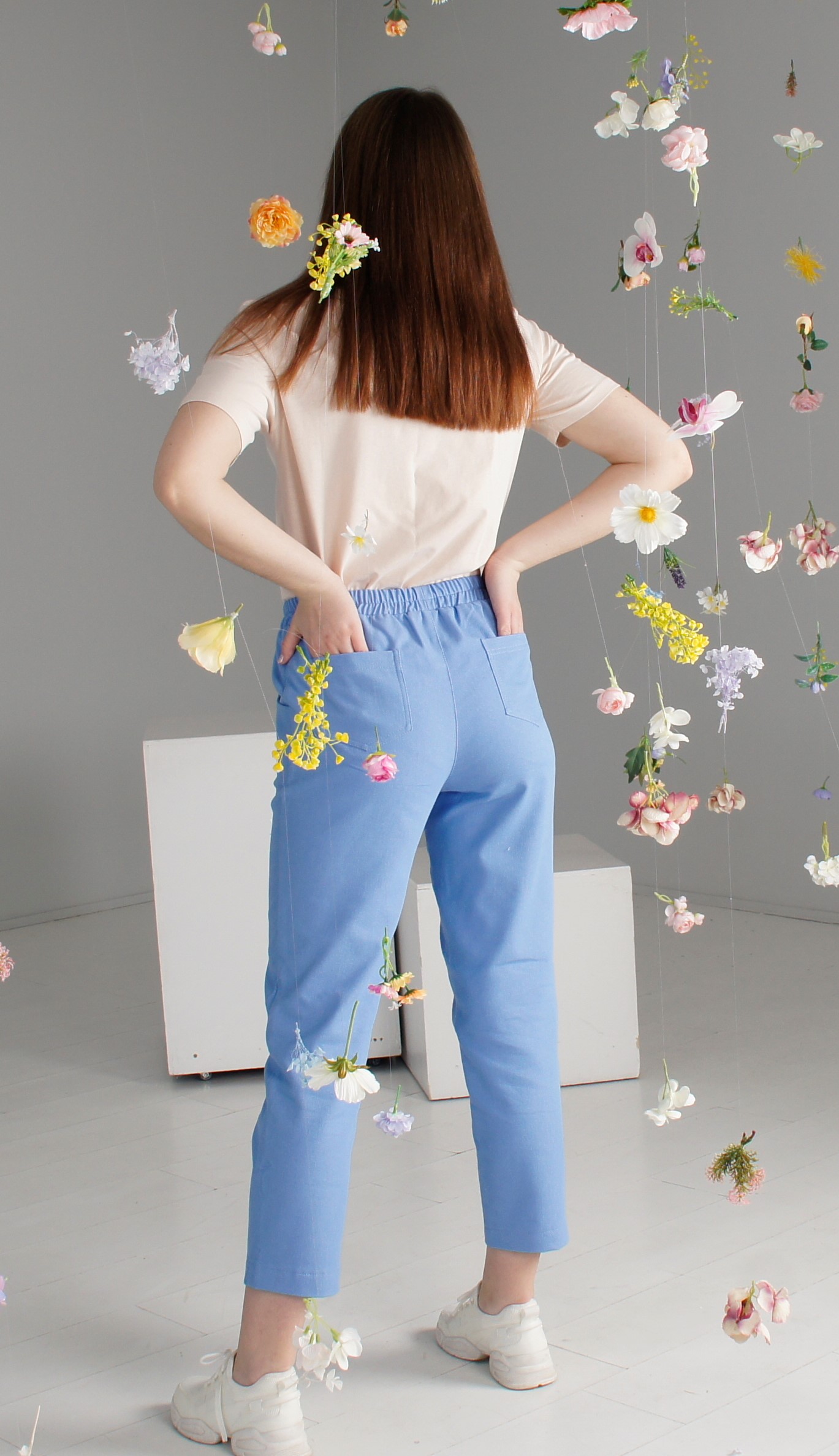 Брюки зауженные классического кроя, пояс на резинке,Передняя часть с карманами, задняя с накладными карманами. Длина 90 см по боковому шву.Состав: хлопок 95% , эластан 5%