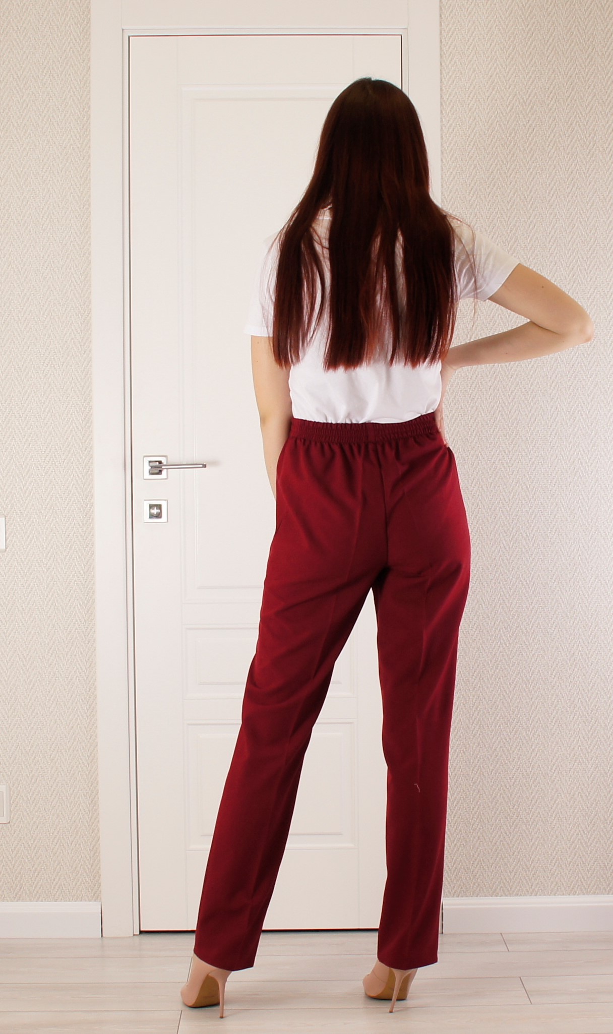 Брюки классического кроя со стрелками без молнии в поясе эластичная лента 4 см.Высокая посадка.Очень удобны и практичны.Длина по боковому шву 104 см , по внутреннему 82 см, ширина внизу 20 см.(Замеры соответствуют 48 размеру). Цвет спелой вишни.