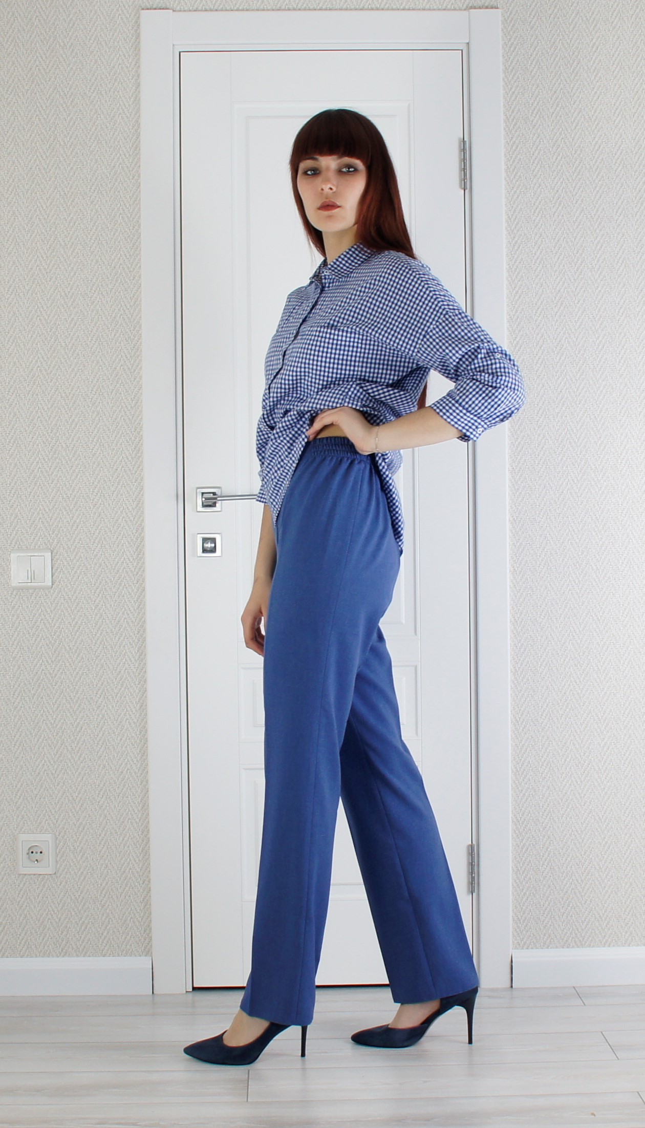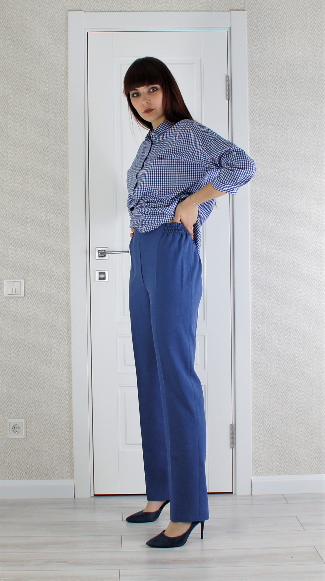 Чисто женская модель для объёмных фигур.Без молнии, пояс на резинке -очень удобны и практичны.Длина 106 см.