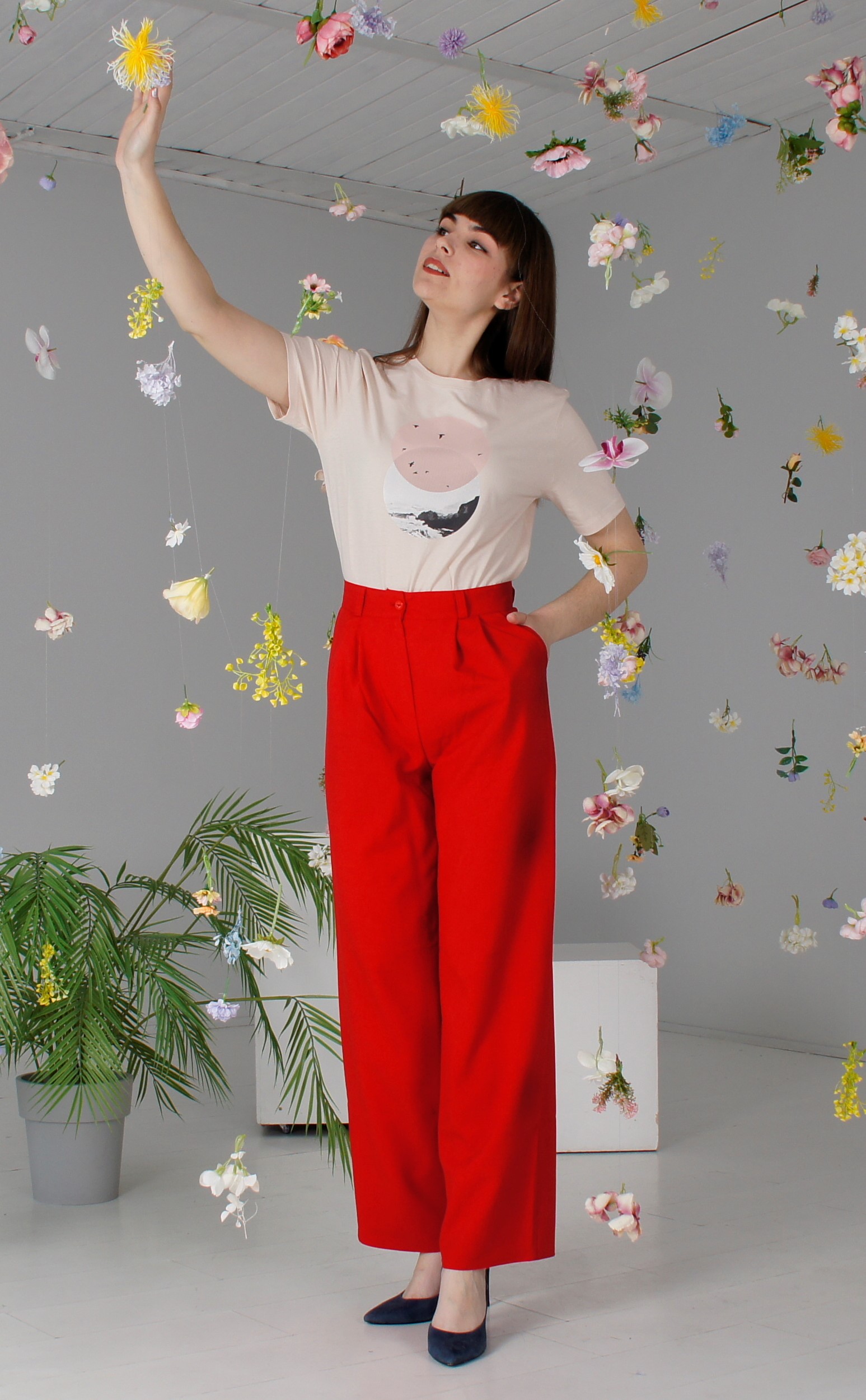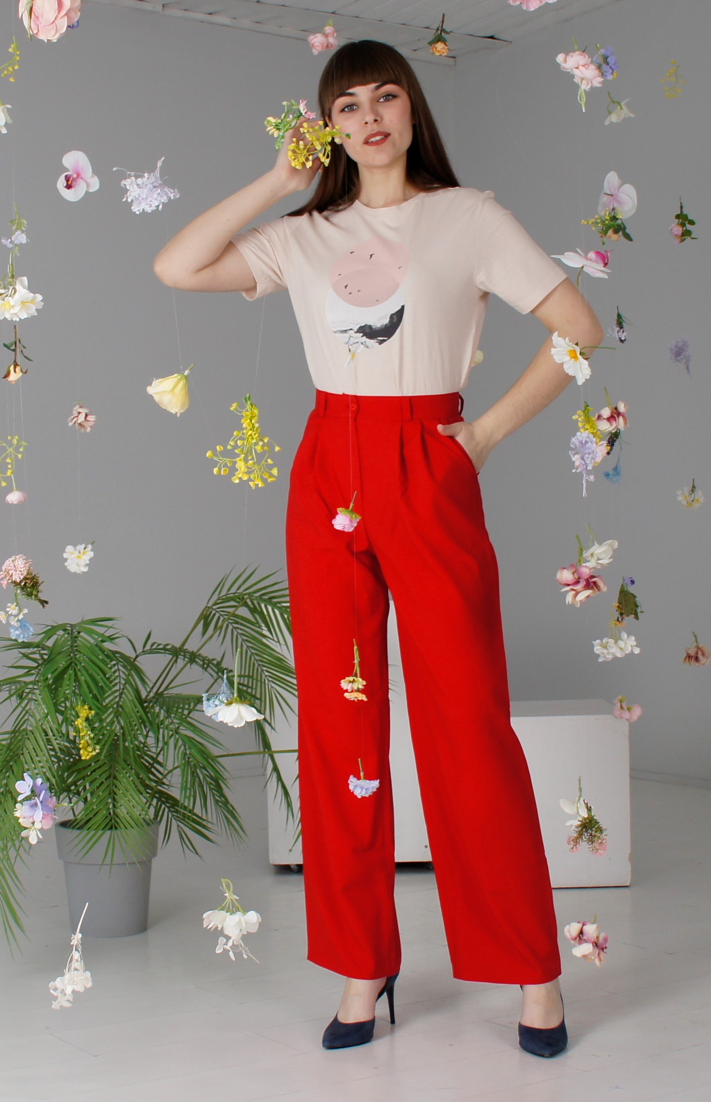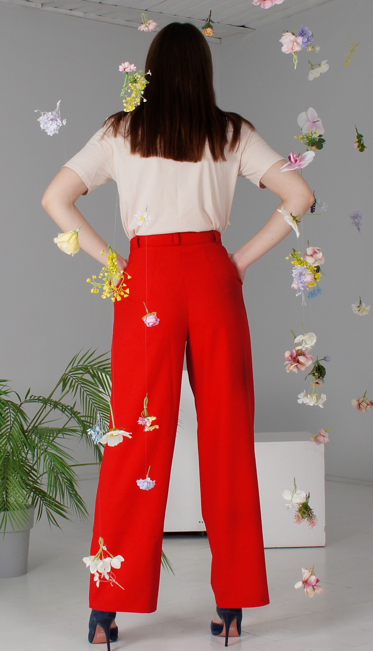 Брюки широкие из легкой мягкой ткани, прямого кроя с застежкой на молнию и пуговки.На передней части имеются карманы и по два защипа с каждой стороны.На поясе имеются шлевки под ремень.Длина по боковому шву 108 см, по внутреннему 81 см, ширина внизу 31,5 см.Цвет красный.(Замеры соответствуют 46 размеру)Состав ткани : Лён 70% , Полиэстер 30%
