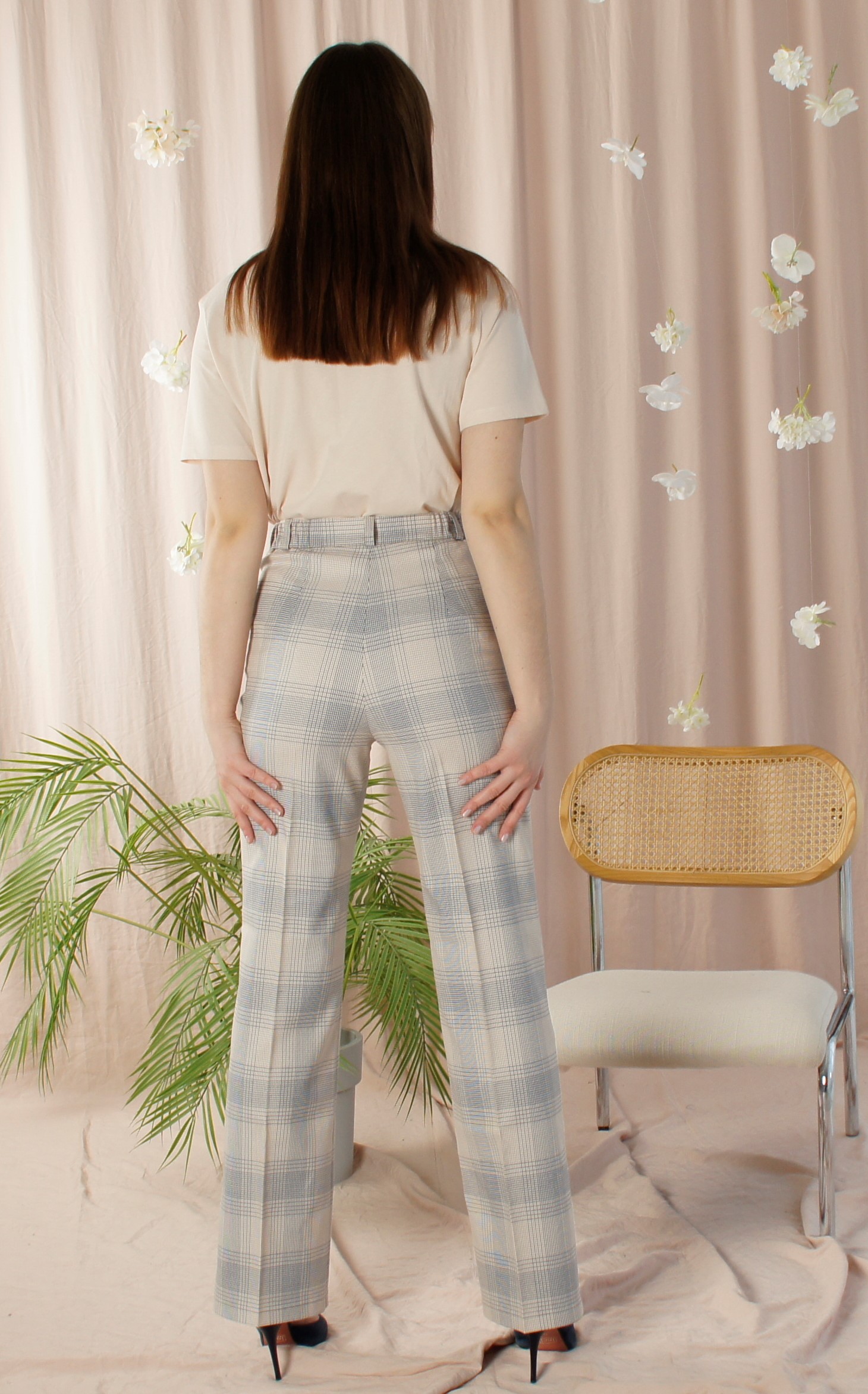 Брюки классического кроя из мягкой костюмной ткани в клетку.Длина по боковому шву 108 см,по шаговому 84 см,внизу 50см.Параметры соответствует 48 размеру.