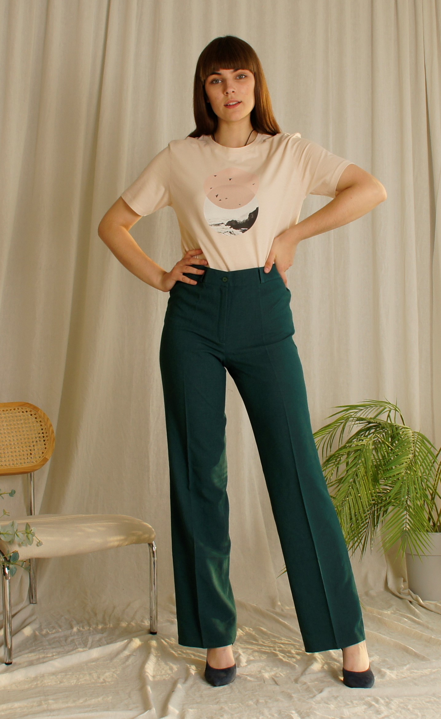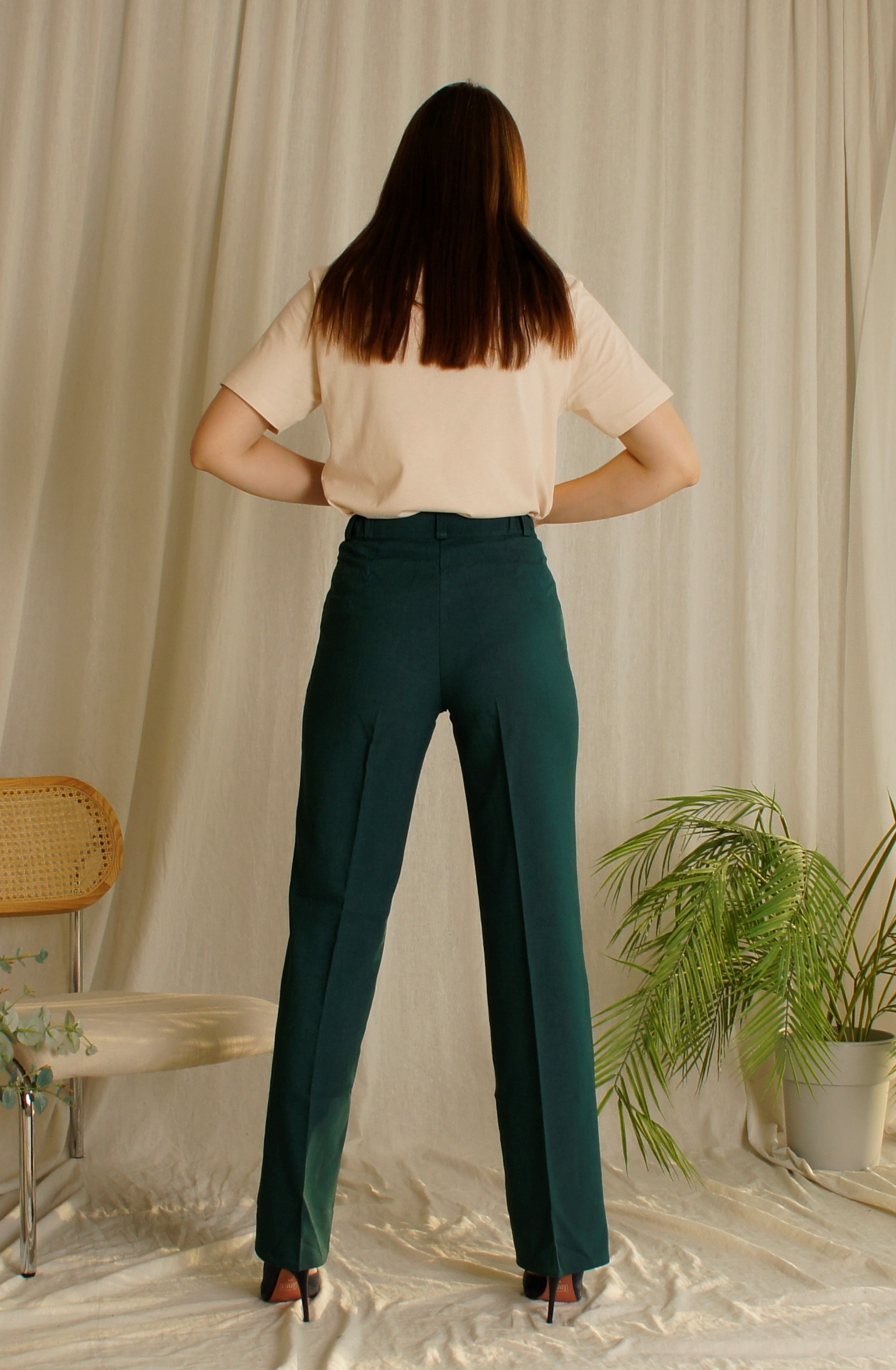 Брюки-трубы прямого покроя, с высокой посадкой, на поясе, с застежкой на молнии и пуговке.На поясе шлевки.Пояс по бокам с резиночками.Длина по боковому шву108 см, по внутреннему 85 см и ширина внизу 26 см.(Замеры проведены по 50 размеру) Состав 70% лён , 30% полиэстер.Цвет изумрудно-зеленый.