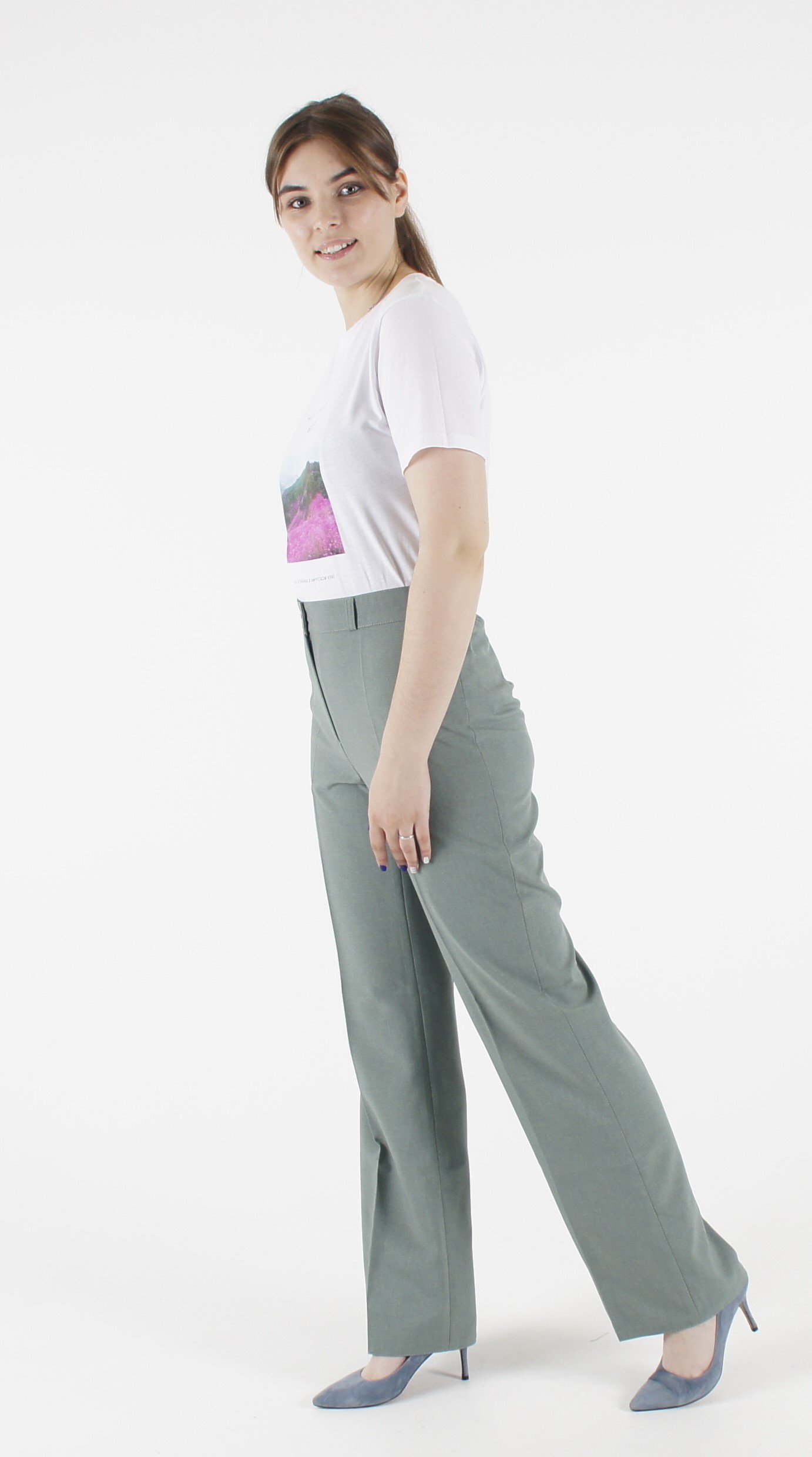 Брюки-трубы прямого покроя, с высокой посадкой, на поясе, с застежкой на молнии и пуговке.На поясе шлевки.Пояс по бокам с резиночками.Длина по боковому шву108 см, по внутреннему 85 см и ширина внизу 26 см.(Замеры проведены по 50 размеру) Состав 70% лён , 30% полиэстер.Цвет олива.
