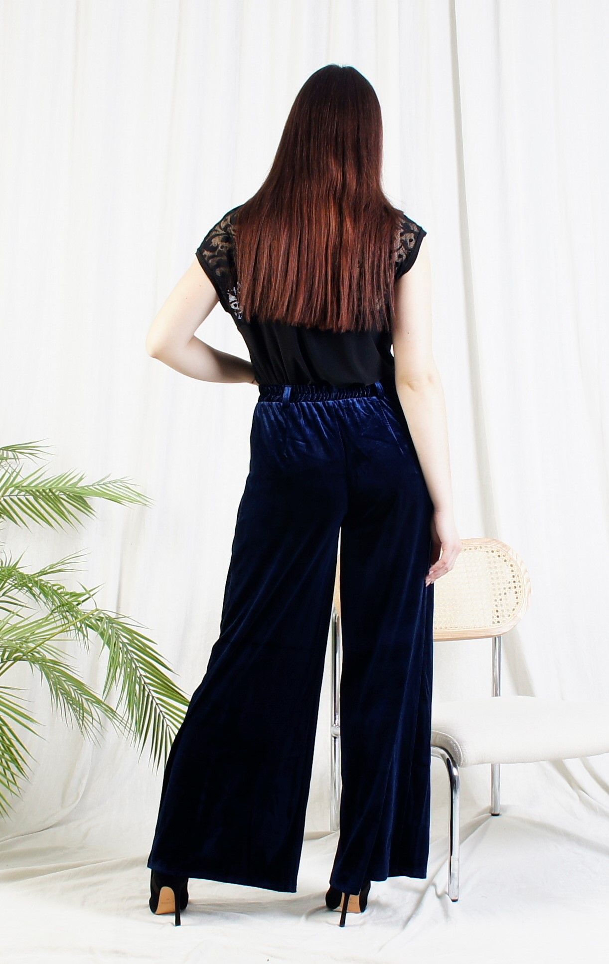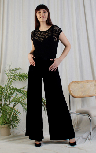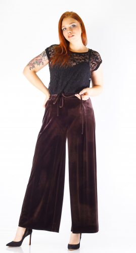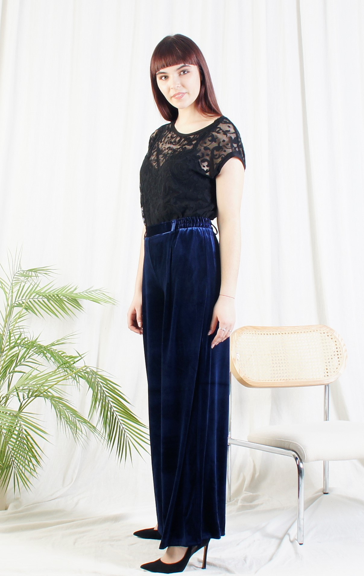 Нарядные брюки из мягкого стрейч-бархата.Ширина внизу 73 см.Длина по боковому шву 102 см.Состав: Полиэстер 100%