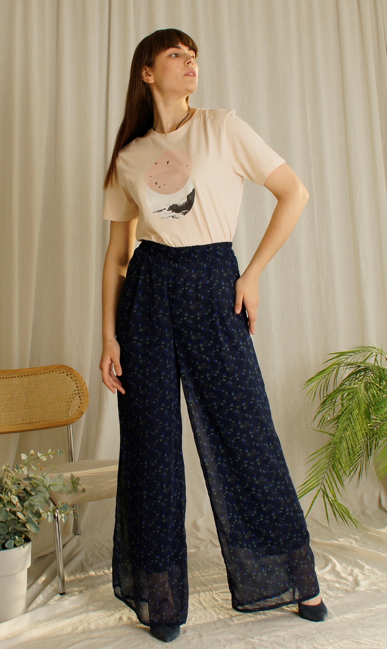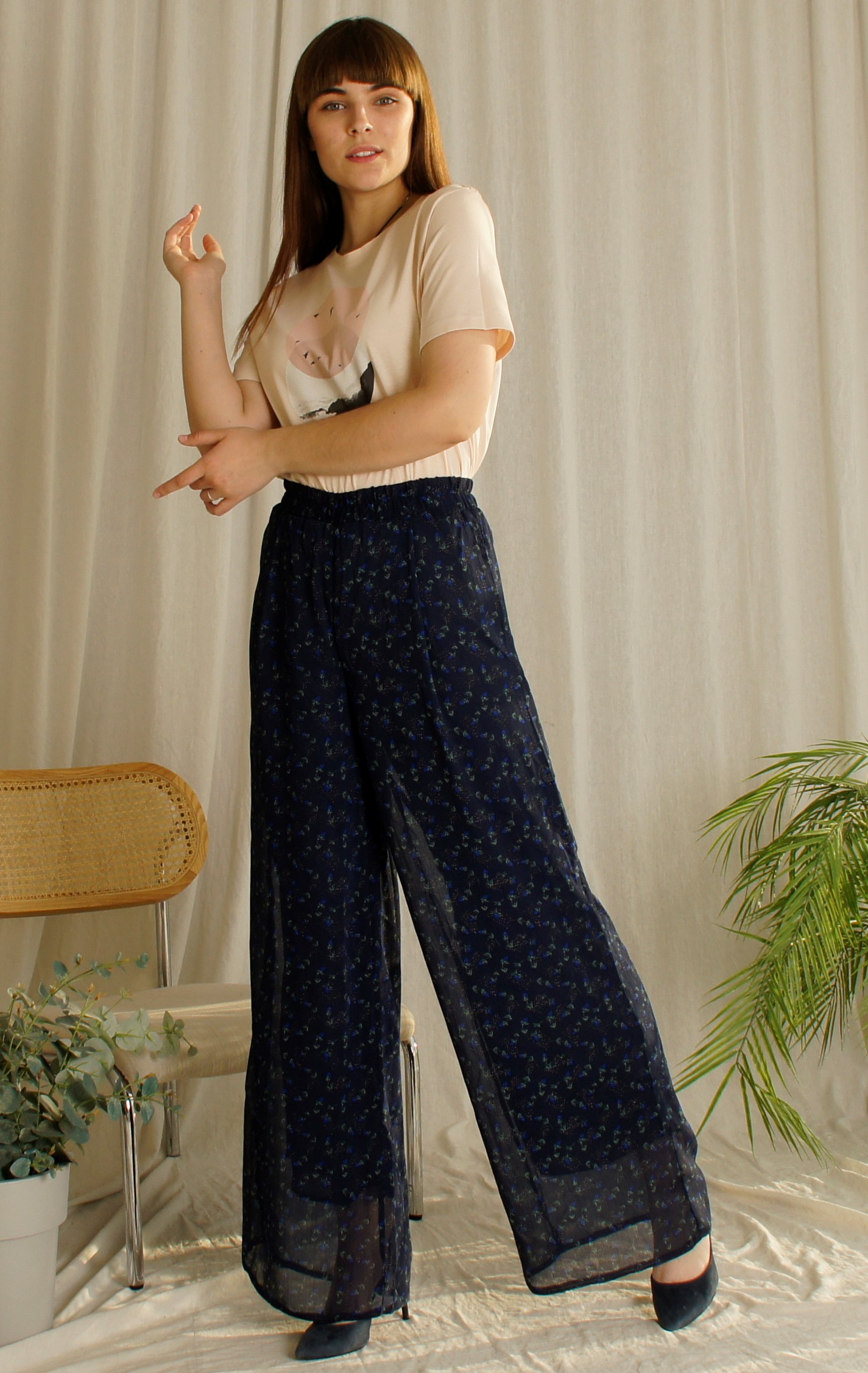 Женские летние брюки Юбка-брюки шифон темно-синие с цветочками