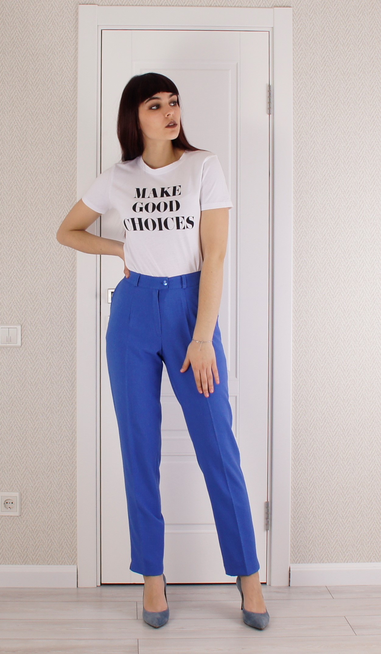 Брюки классического кроя, на поясе со шлевками и застежкой на молнию, с карманами спереди, заужены книзу.Состав ткани: Лен 70%, Полиэстер 30%. Длина 100 см.