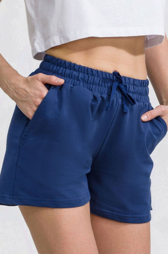 Летние шорты для женщин отлично сидят на фигуре, а также хорошо подходят для спорта, для дома, для тренировок и для прогулок. Однотонные шорты из футера не сковывают движений. Синие шорты имеют высокую посадку, пояс регулируется шнурком.