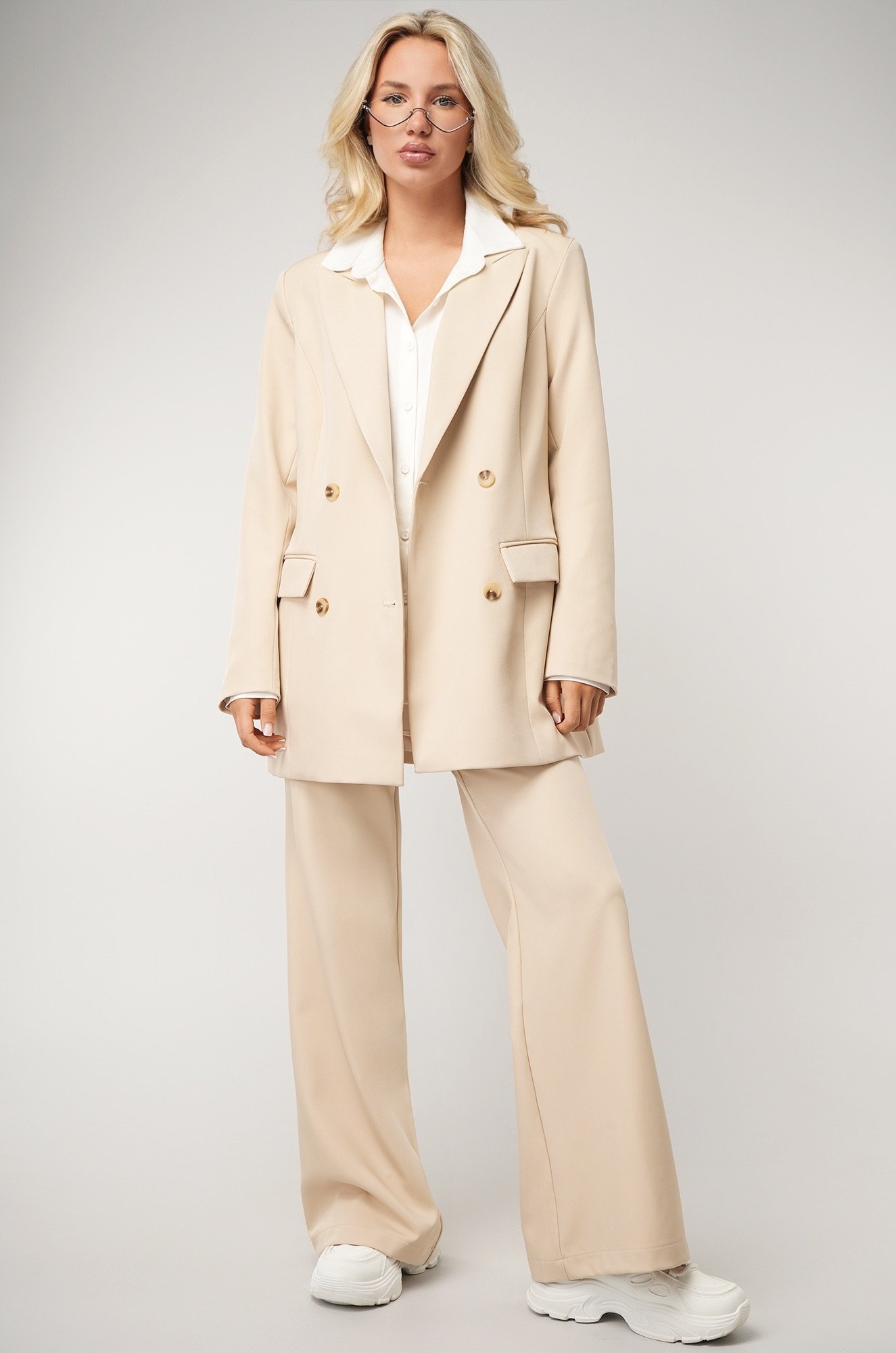 Удлиненный двубортный пиджак с лацканами создает подчеркнуто строгий и официальный стиль, а приталенный силуэт и карманы добавляют функциональности и изысканности. Брюки с высокой посадкой придают образу грацию и динамичность, гармонично завершая стильный наряд.