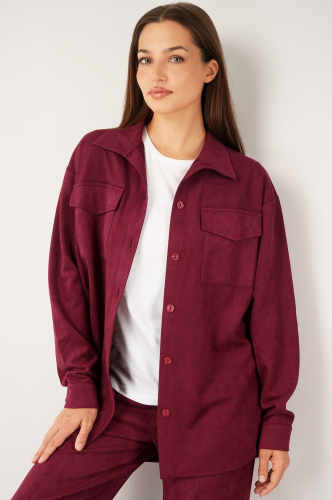 Брюки палаццо на резинке и рубашка оверсайз с нагрудными карманами создают женский комплект, который одинаково уместен для девушек и женщин и в офисе, и на прогулке. Вельветовый костюм цвета бордо будет незаменим как базовый, даря комфорт в осенний или весенний сезон.
