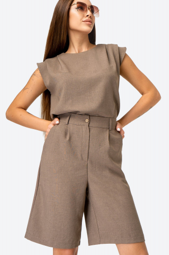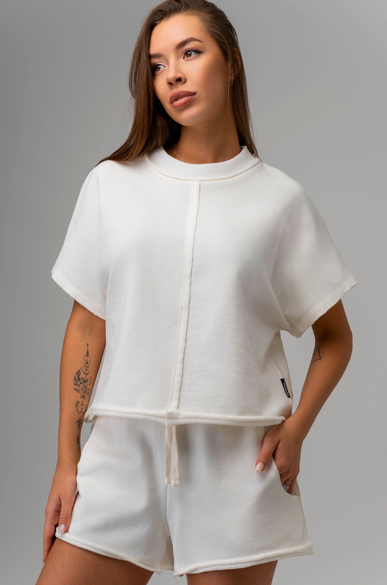 Женский спортивный костюм с шортами выполнен 100% хлопка. Костюм оттенка экрю станет идеальным дополнением для активного отдыха или уютного домашнего времяпрепровождения.