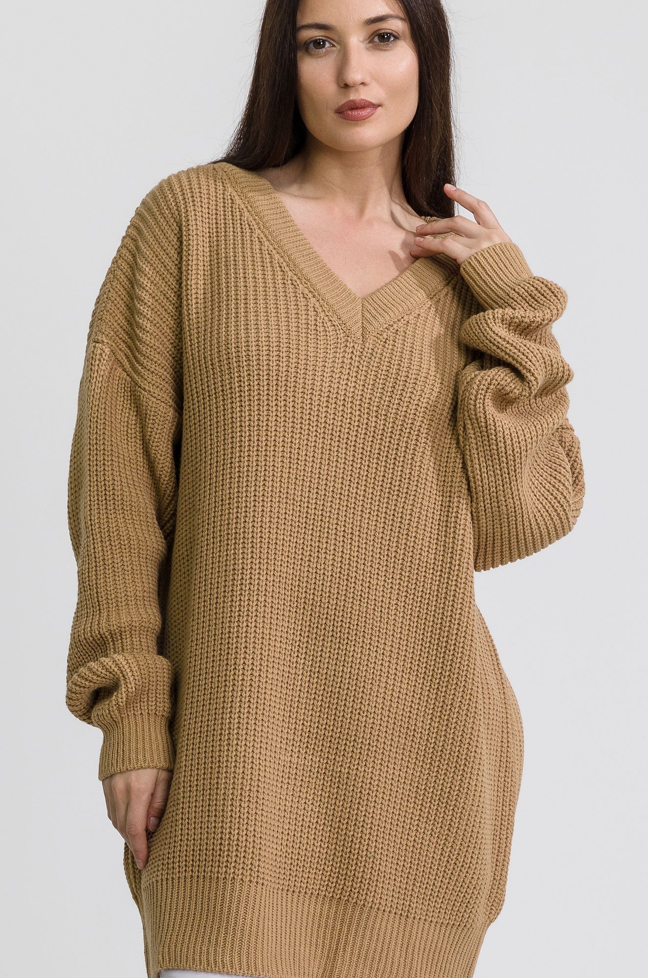 Женский удлиненный джемпер оверсайз с V-образным вырезом аккуратно открывает шею, подчеркивая изящность своей обладательницы. Благодаря свободному крою и минималистичному дизайну бежевый свитер oversize надолго сохранит свою актуальность.