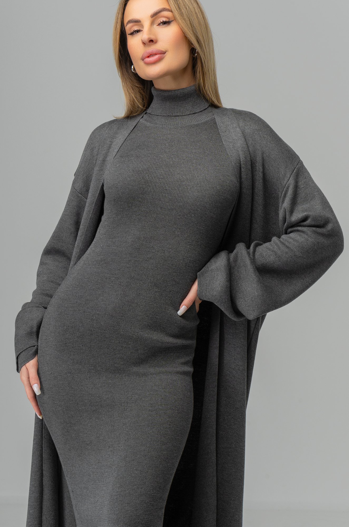 Облегающее платье миди с высоким горлом и удлиненными рукавами акцентирует внимание на силуэте, создавая женственный и соблазнительный образ. Кардиган с широкими рукавами, свободного прямого кроя можно завязать на пояс, что подчеркнет изящную талию. Такое сочетание идеально соответствует запросам современных женщин, стремящихся совмещать стиль и комфорт.