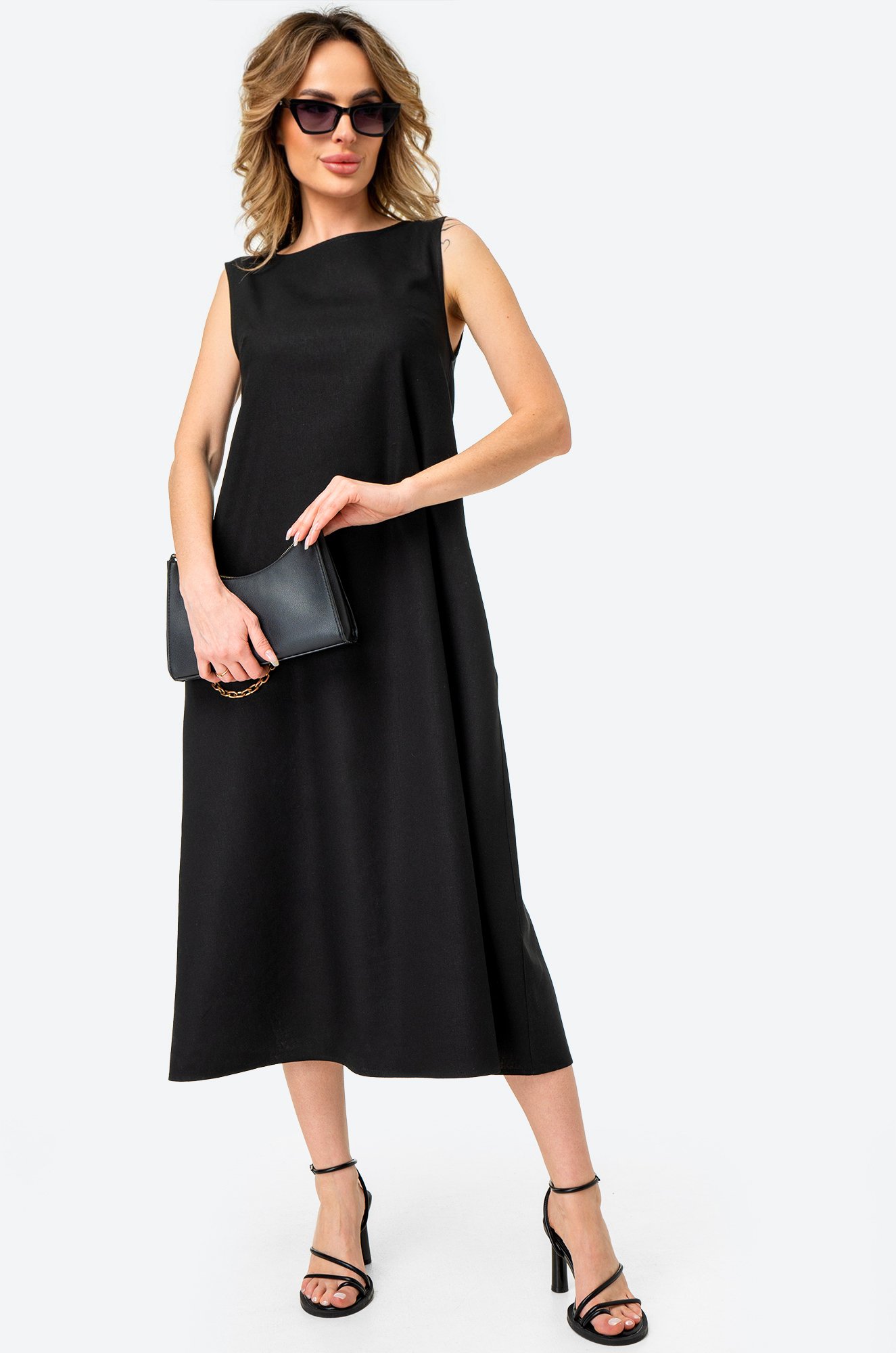 Ткань из 100% льна выглядит роскошно и приятна к телу. Лен отличается высокой прочностью, сохраняет ощущение прохлады в жаркую погоду. Однотонный черный сарафан – идеальное решение для лета, прекрасно подходит для дня на пляже или праздничного мероприятия.
