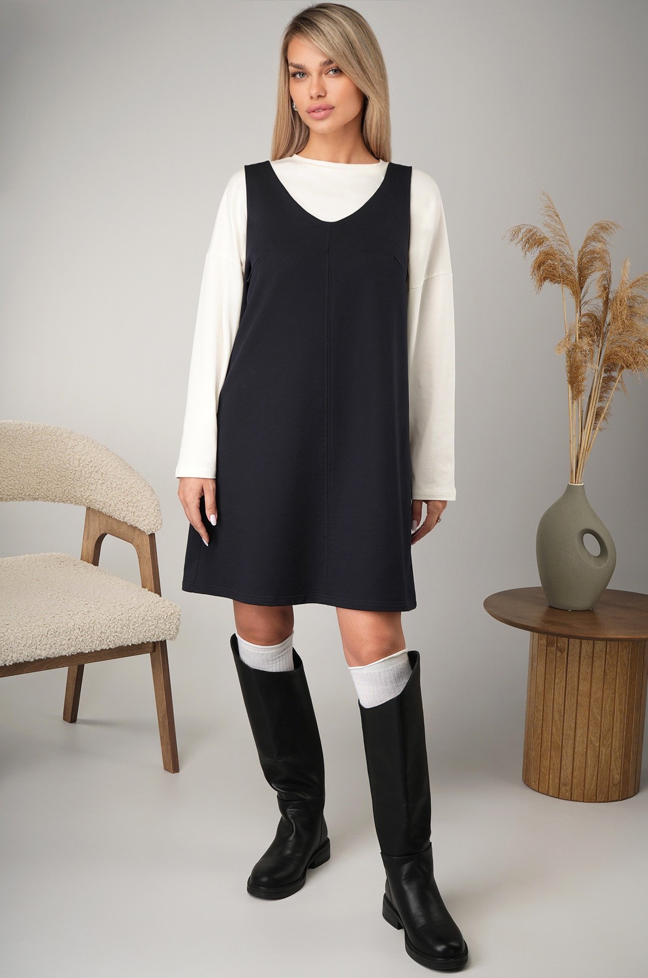Свободный силуэт оверсайз, глубокий круглый вырез и отсутствие рукавов делают трикотажный сарафан воплощением современного минимализма. Хлопковое синее платье создано для женщин, которые ценят гармонию комфорта и стиля — на работе, на прогулке или в любом повседневном моменте.
