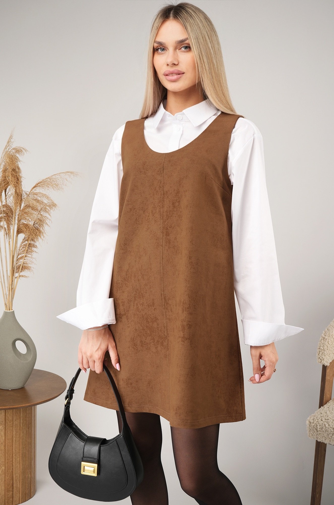 Свободный силуэт, глубокий круглый вырез делают трикотажный сарафан мини воплощением современного минимализма. Демисезонный сарафан варенка для женщин подойдет для осенних и весенних образов.