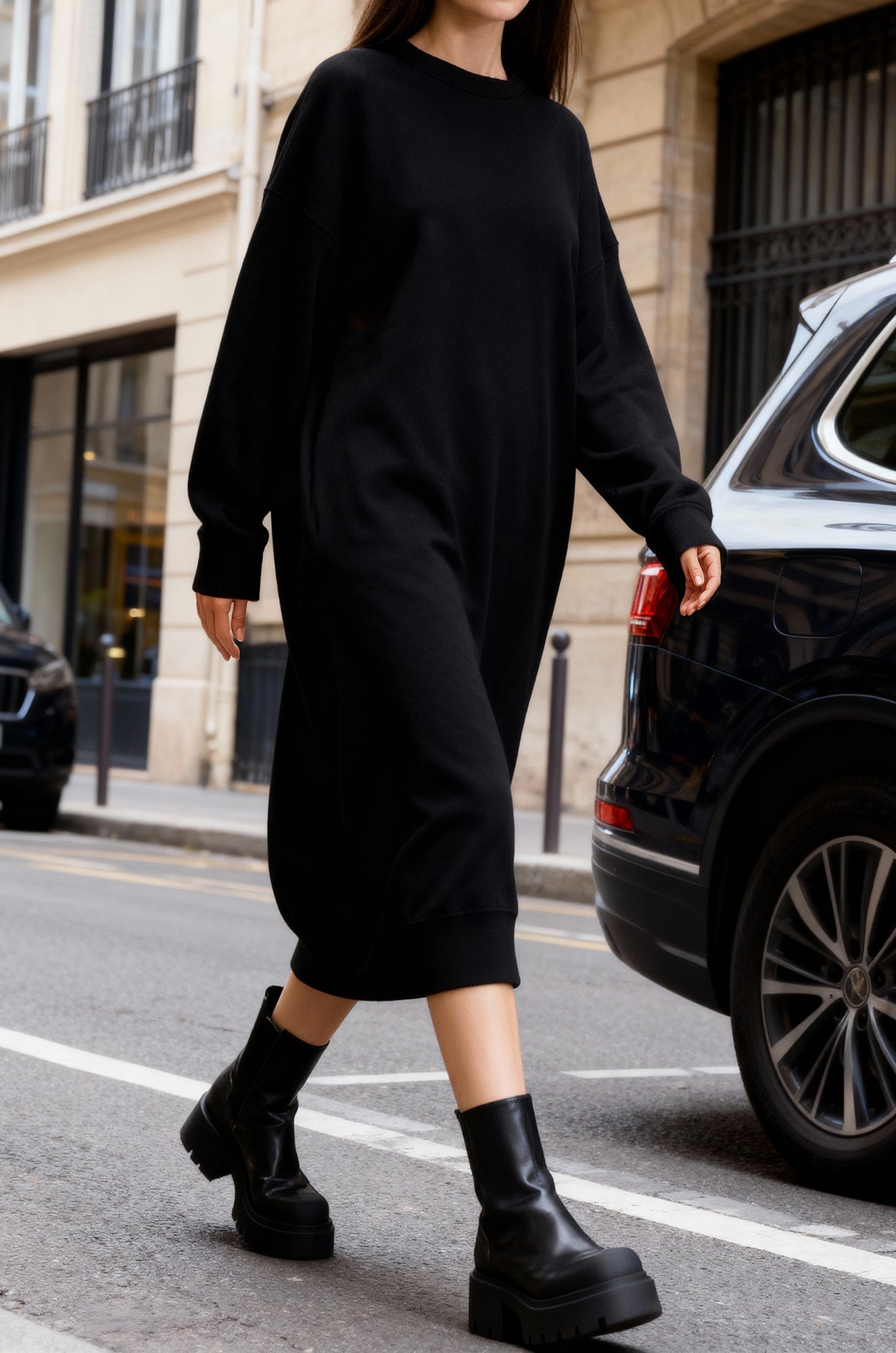 Благодаря плотной вязке и акрилу в составе трикотажное платье-свитер не растягивается и сохраняет форму при частых стирках. Черное платье длины миди удобное, не сковывает движений и практически не мнется, что важно в дороге или дома.