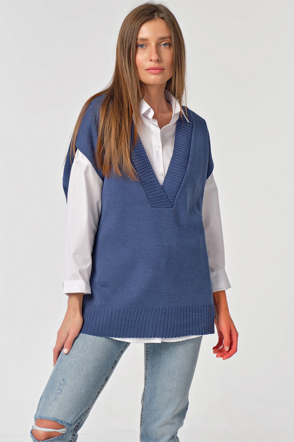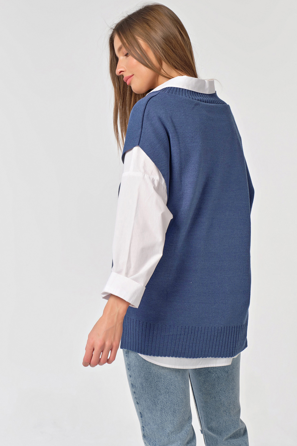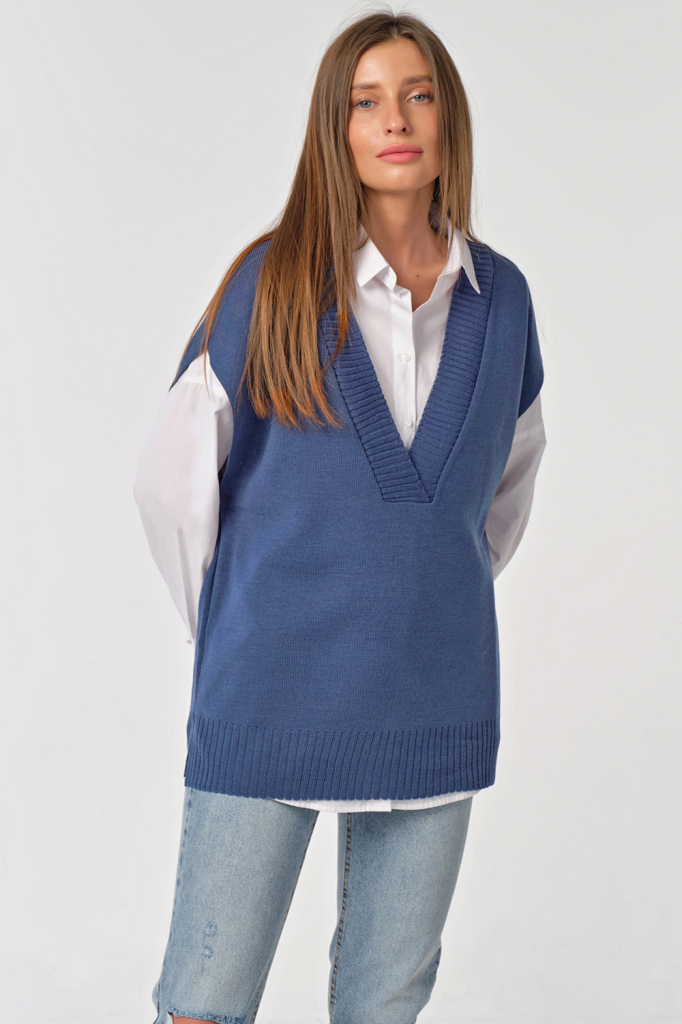 ст. цена1293руб.! Жилет вязаный оверсайз с разрезами по бокам синий