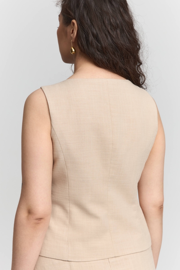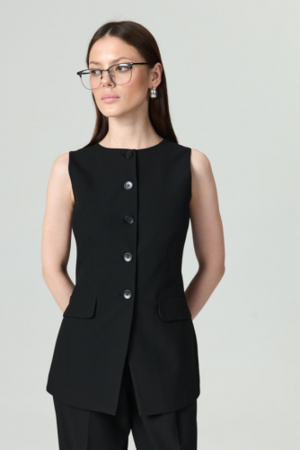 Жилет приталенного силуэта из благородного фактурного хлопка на подкладе с фигурной линией выреза груди, фигурным низом и рельефами, застежка на пуговицы. Идеально моделирует силуэт "песочные часы".