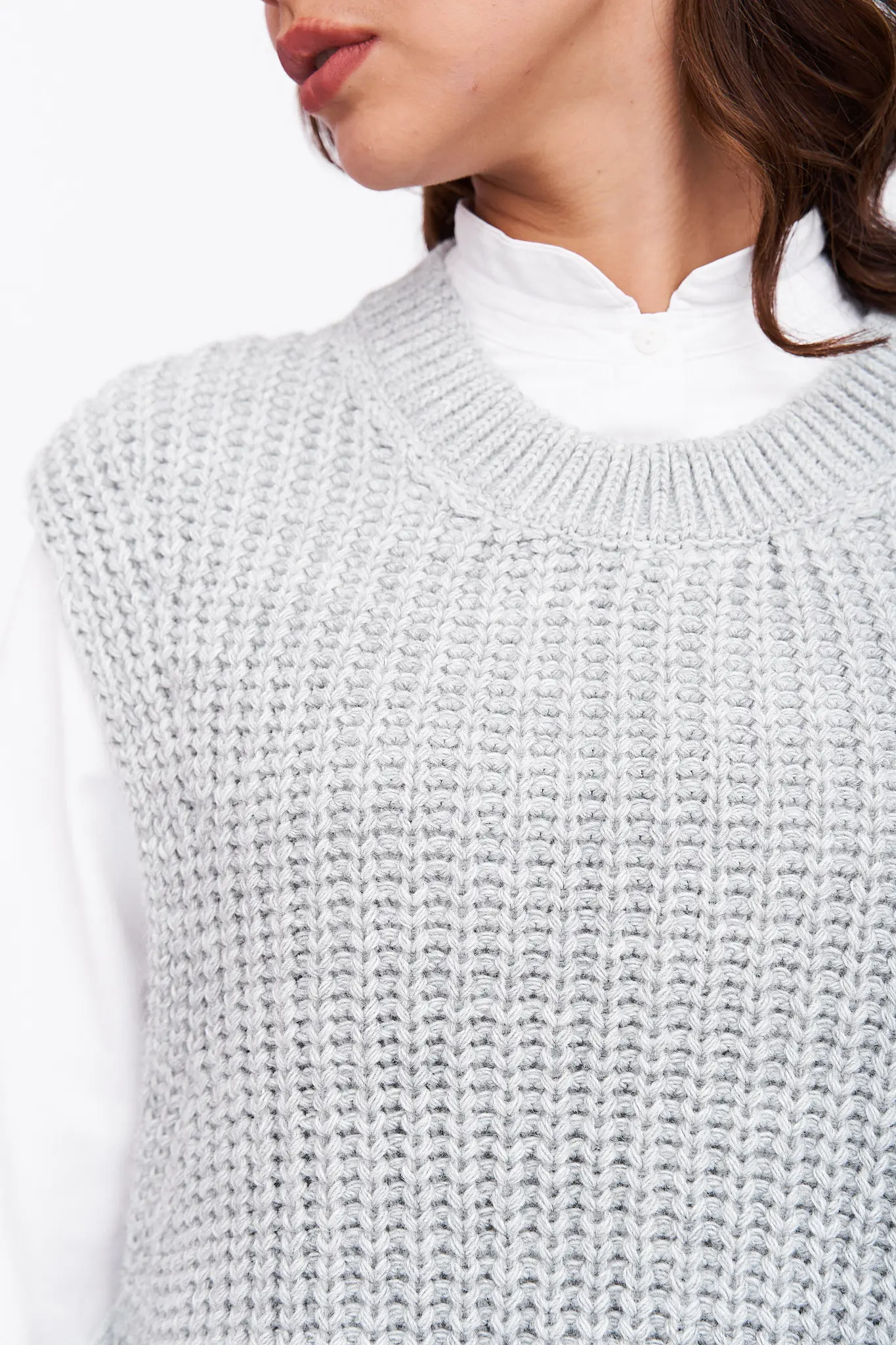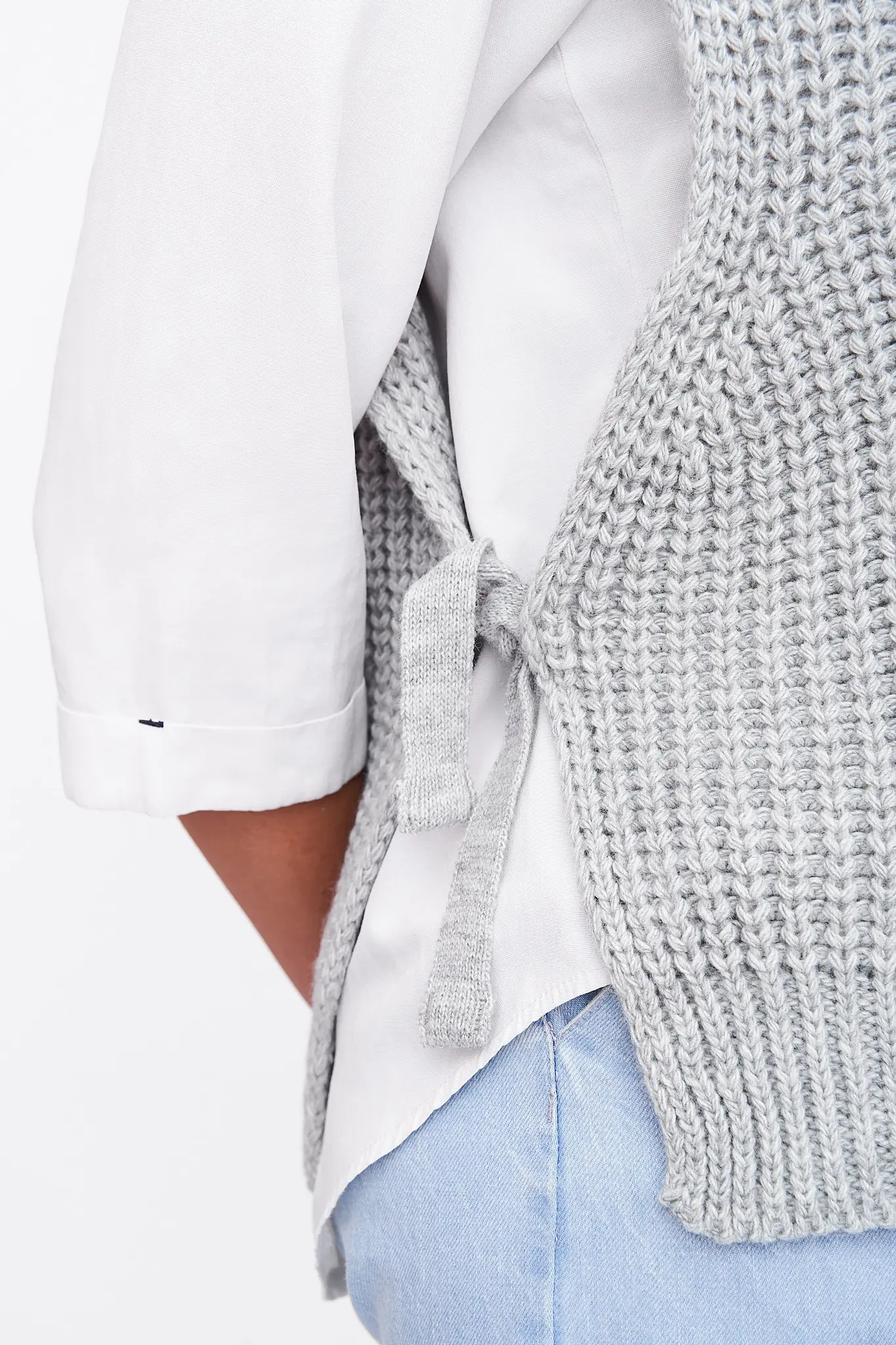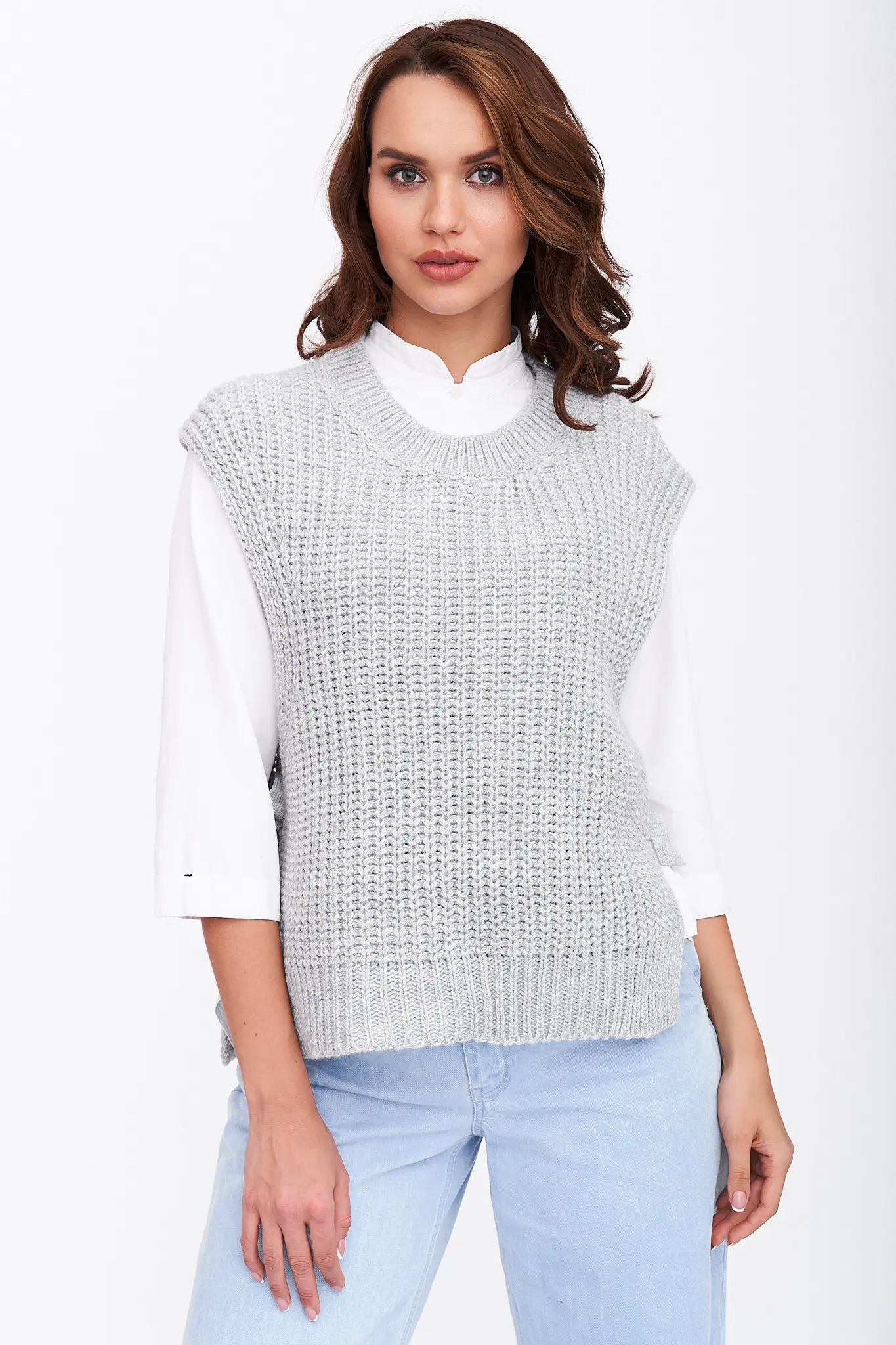 Оригинальный жилет прямого кроя.  Круглая горловина с широкой эластичной резинкой, плечо спущенное. Удлиненная спинка,  которая соединяется с передом по бокам трикотажными лентами, Можно надевать в офис и школу поверх блуз, очень практичный в использовании. св.серый