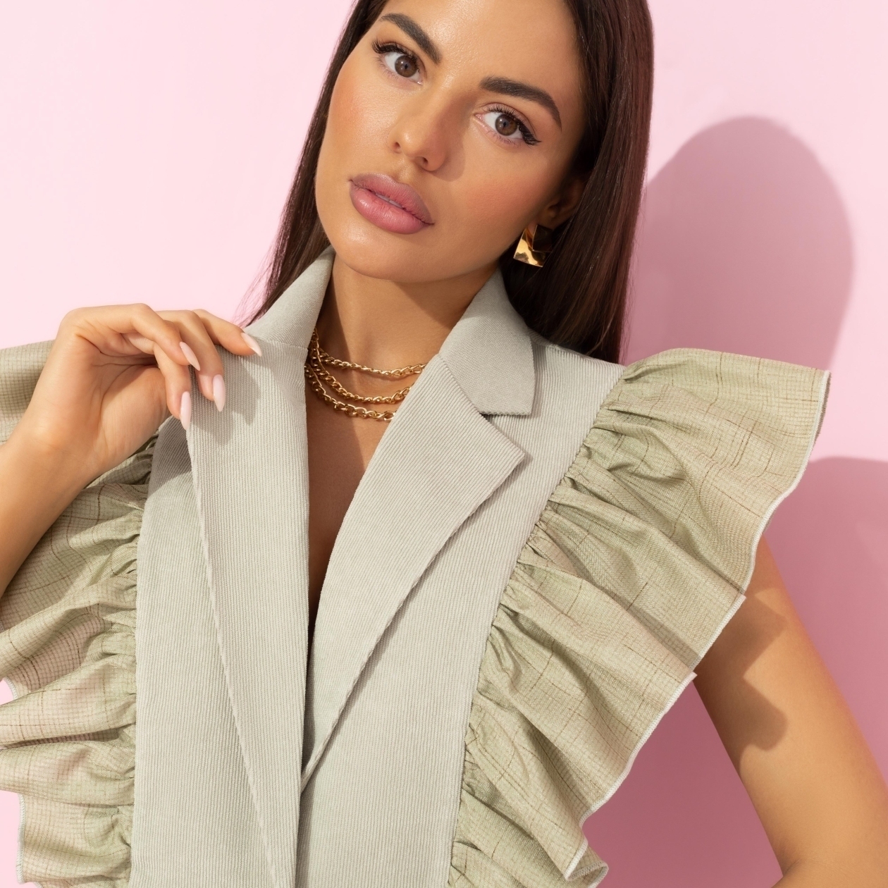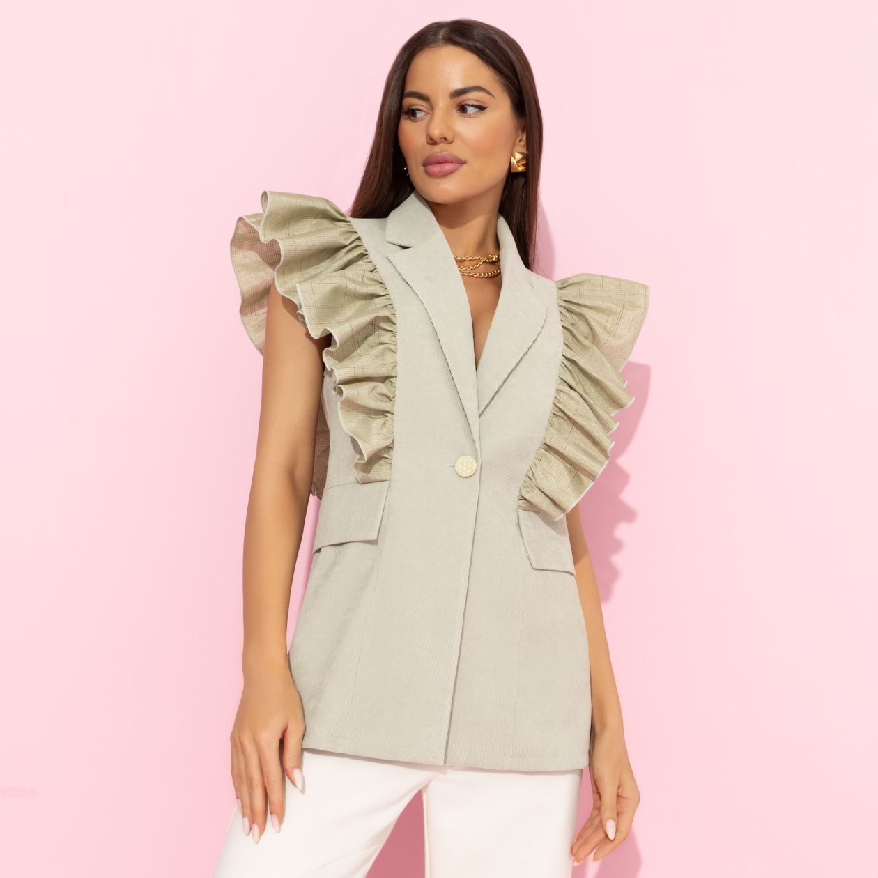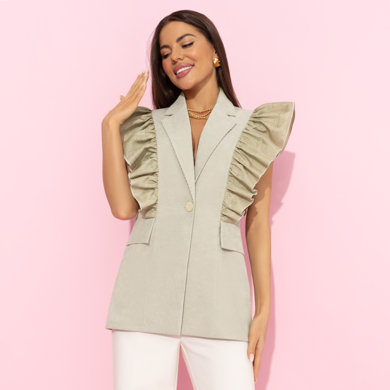 Керри Бредшоу предпочитала хранить деньги там, где их видно – в своем шкафу. Такая финансовая грамотность нам подходит. Сделайте вклад в виде жилета CHARUTTI. Беспрецедентная по выгоде сделка! Жакет однобортный с лацканами без рукавов. Имитация карманов. Симметричный объемный декор в виде рюш на передней и задней стороне изделия.