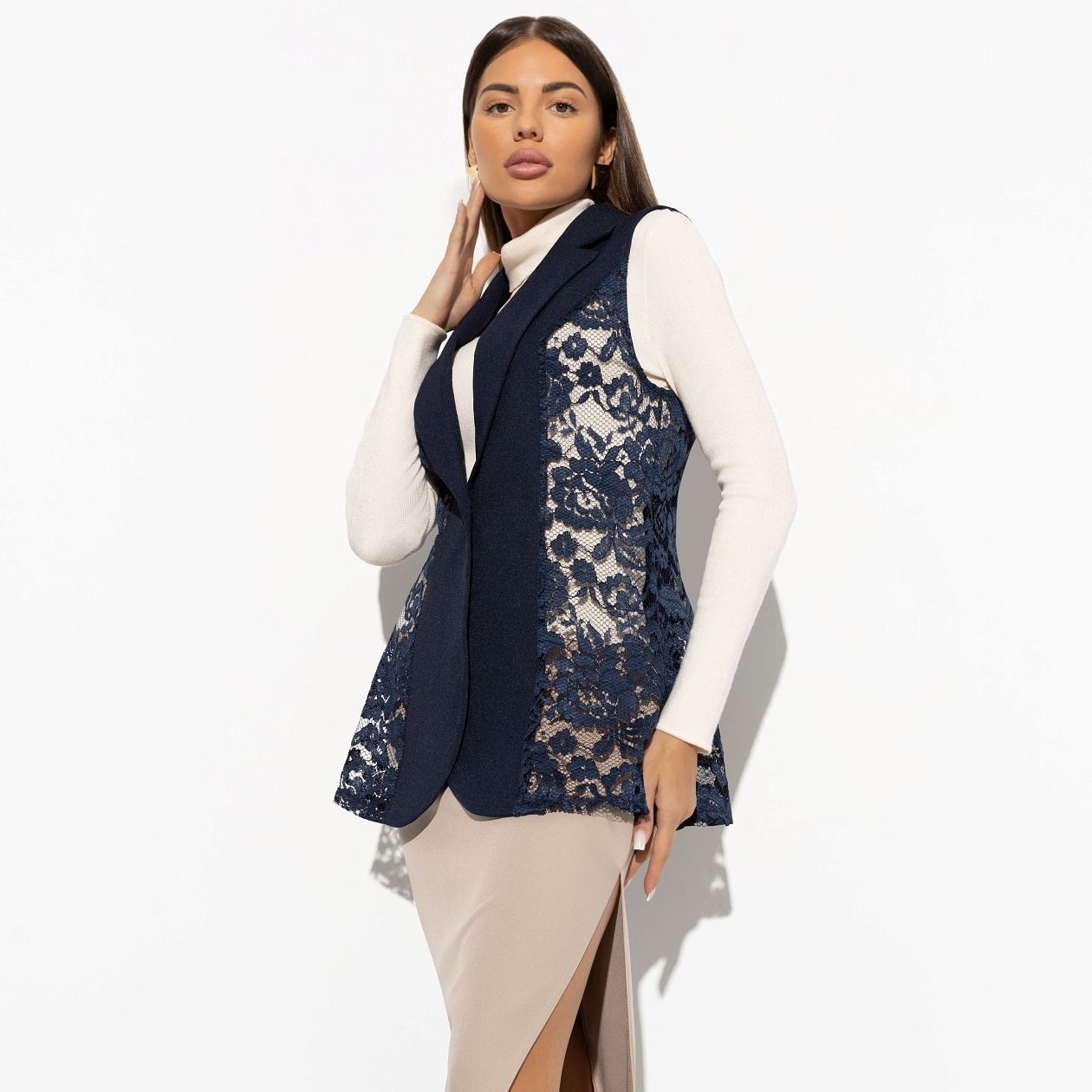 Проведенный среди мужчин опрос показал, что из всех видов ткани, кружево считается максимально привлекательным материалом. Не то, чтобы мы этого не знали, но выводы сделаем. Будем носить кружево на работу в виде жилета ЧАРУТТИ. Жилет приталенного силуэта с лацканами глубокого синего цвета. Застегивается на акцентную пуговицу. Длина изделия чуть ниже линии бедра.