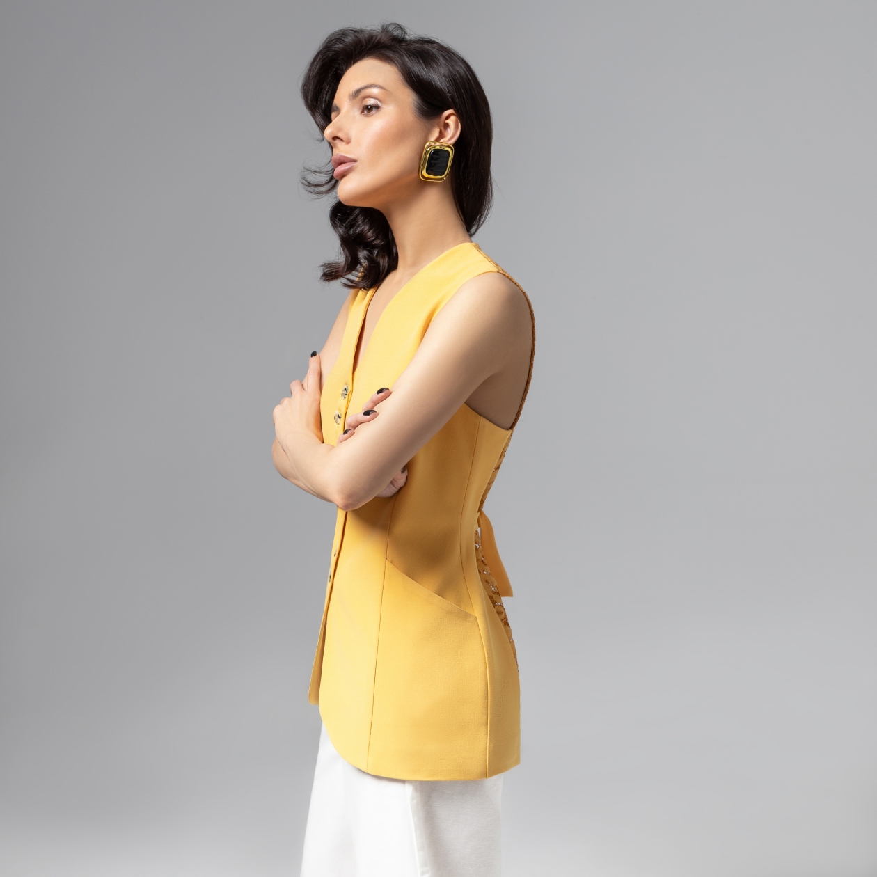 Быть собранной и элегантной – ваше кредо. Приталенный жилет из коллекции PREMIUM подчеркивает – вы женщина со стержнем внутри. С изюминкой и умением быть яркой. Безупречный микс качеств. Жилет удлиненный, классического силуэта. Изделие с карманами. Спинка из кружева. Талия регулируется по спинке.