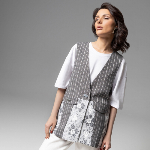 «Искусство переговоров» – это диалог формы, фактуры и намёков. Удлинённый силуэт, нежное кружево и безупречный серый создают образ, где женственность и уверенность идут рука об руку. Жилет прямого кроя. Дополнен кружевом первоклассного качества. Эксклюзивная фурнитура. Имитация карманов. Есть подклад.
