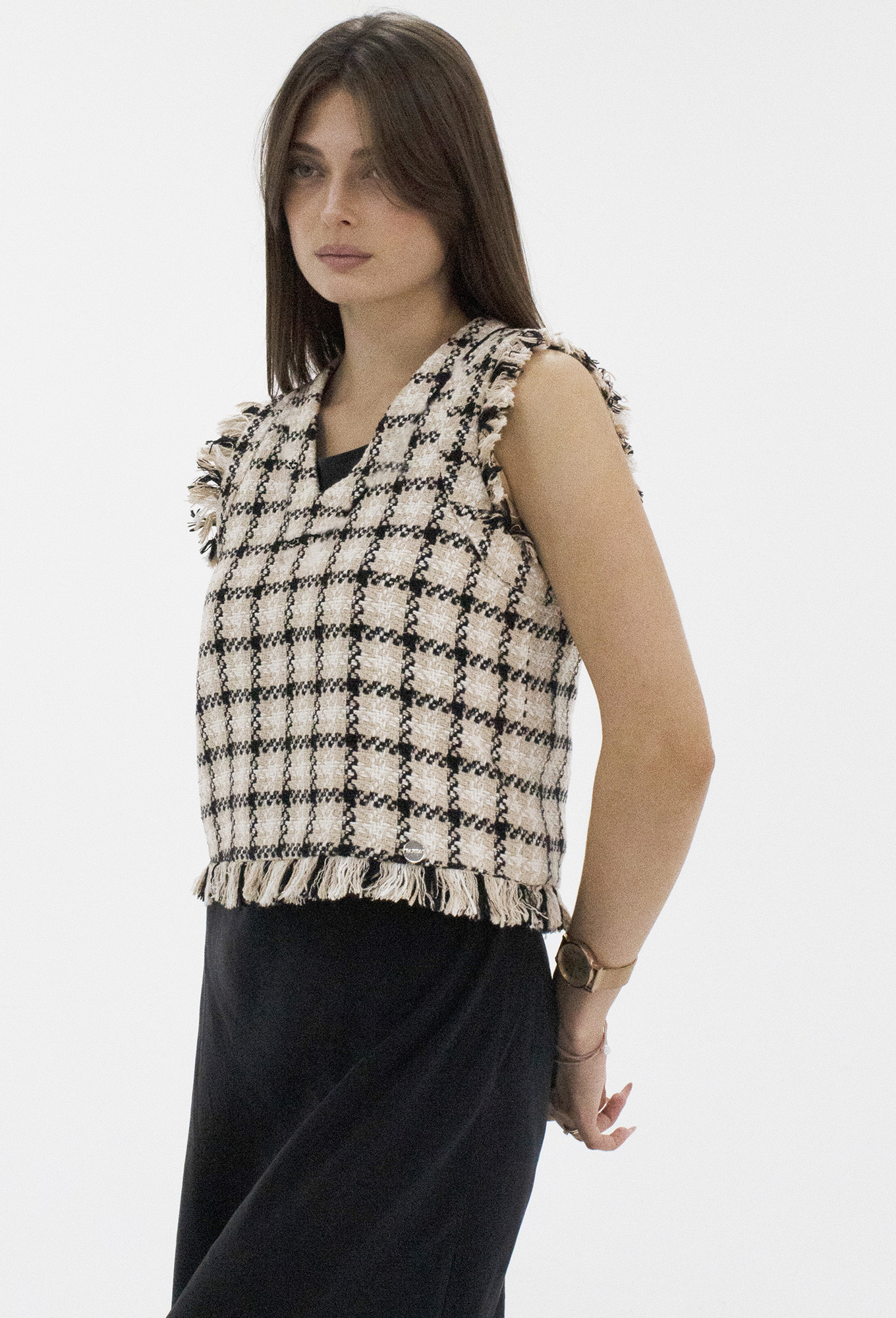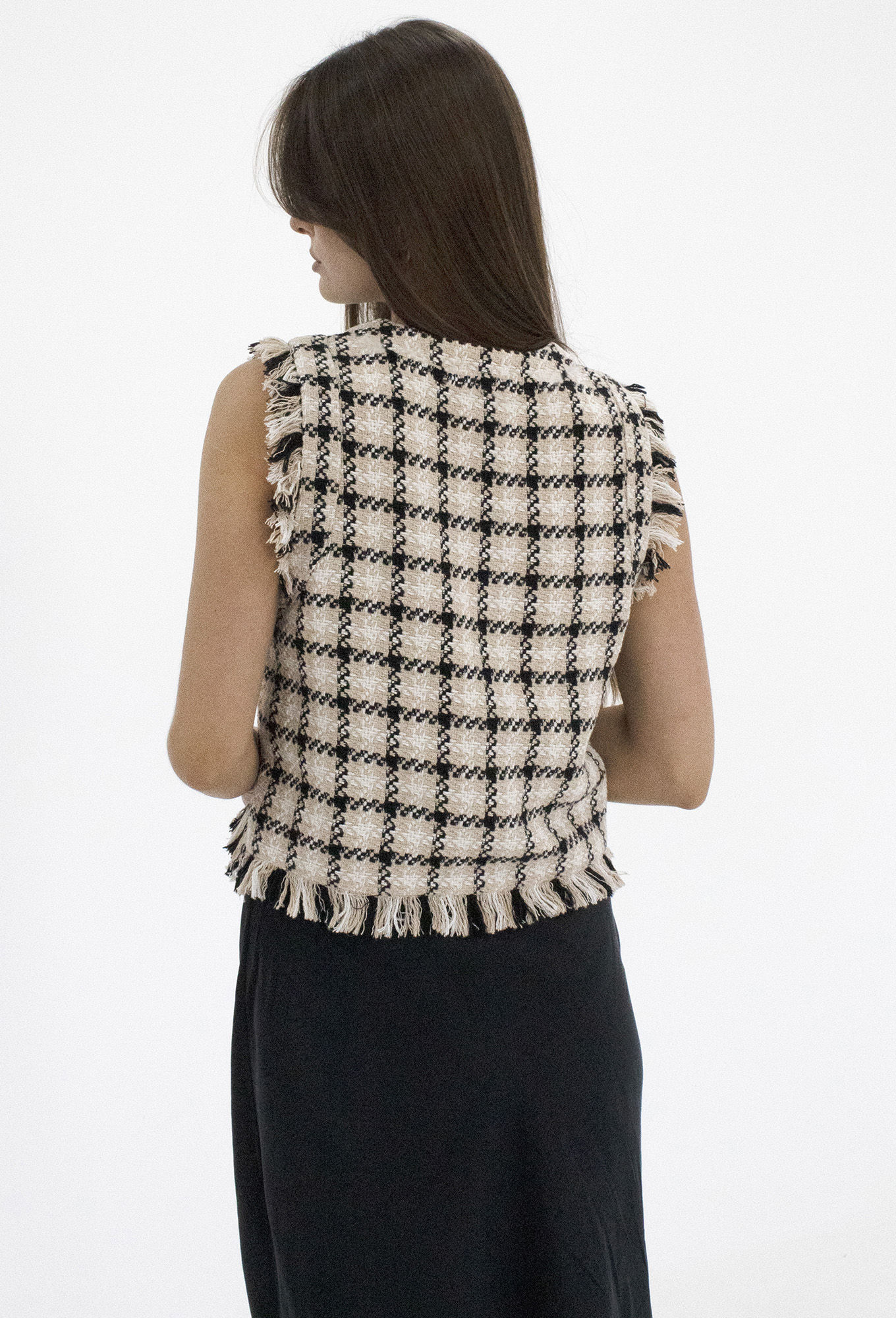 Модель: Панда 68838 бежевый Рост:..показать 164 см (рост модели на фото 170см) Сезон: Осень-Зима Тип ткани: Хлопок 77%, полиэстер 15%, вискоза 8%.Стильная молодежная жилетка из ткани в клетку. Жилетка укороченная, с V-образным вырезом горловины. По низу жилетки и по проймам имеется отделка бахрома из основной ткани. Такая жилетка отлично сочетается с различными джемперами или рубашками, создавая стильный осенний образ.