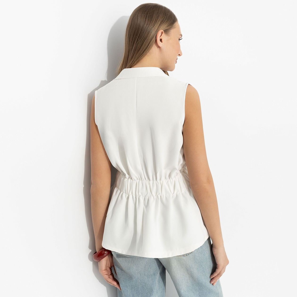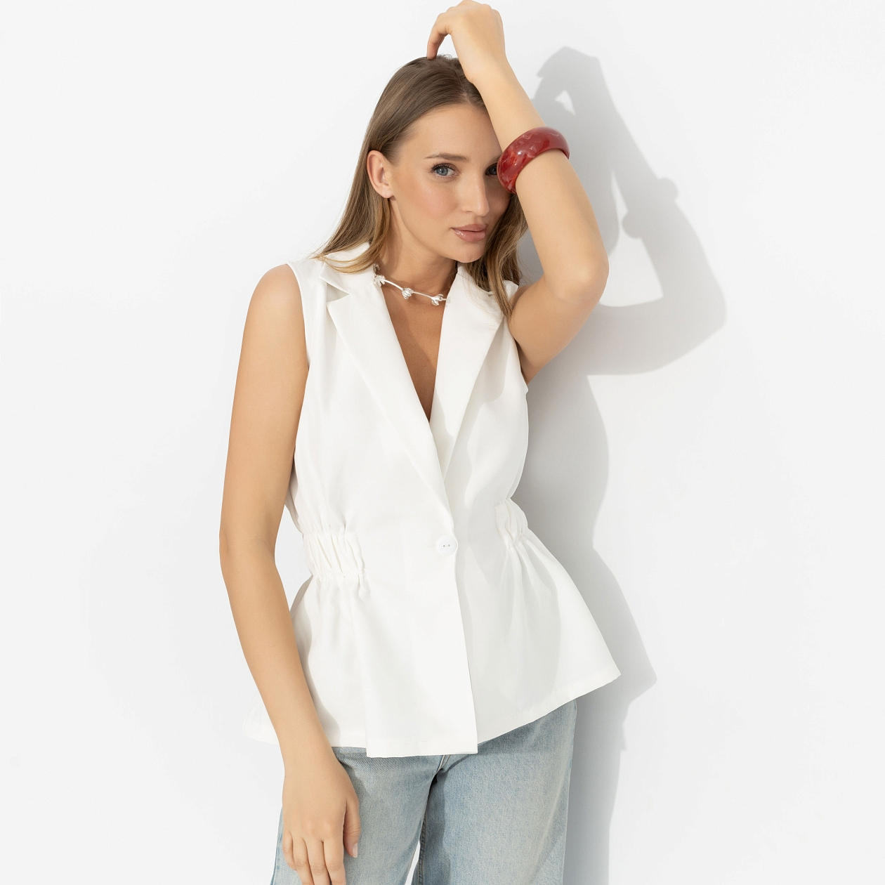 Её взгляд яркий и светящийся, а каждый взмах рук наполнен чувствами. Женщина CHARUTTI живет свою лучшую жизнь. В жилете она прогуливается по городу, организует пикник с круассанами и матча-латте для себя одной и балует прохожих искрящейся улыбкой. Жилет с лацканами приталенного силуэта. Линия талии оформлена скрытой резинкой. Жилет застегивается на пуговицу.
