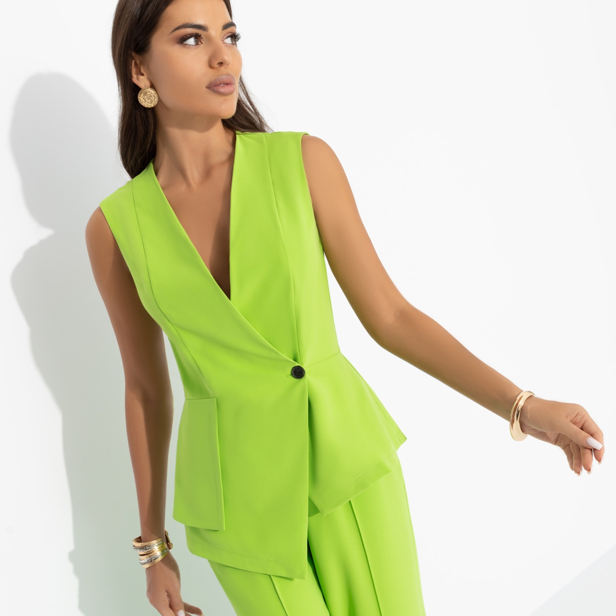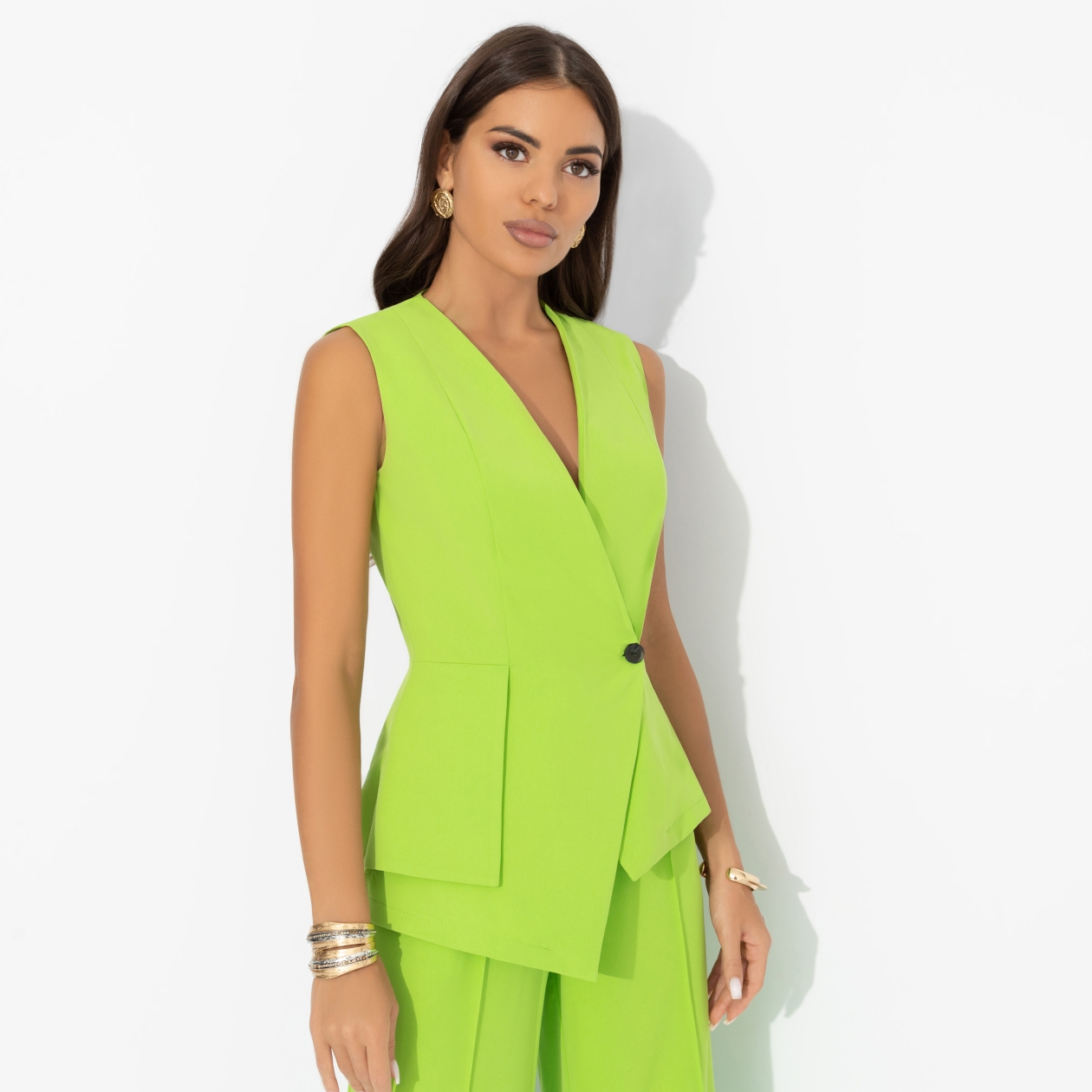 Мама всегда одевала тебя ярко. Так ей было удобно видеть тебя из окна. Но ты взяла лучшее из этого опыта – умение играть с оттенками и смелость быть выразительной. Жилет CHARUTTI в цвете сочного лайма не пугает тебя, а соблазняет. Ты с удовольствием принимаешь модный вызов. Жилет приталенного силуэта. Однобортный, без лацканов. Асимметричный крой изделия. Застегивается на пуговицу.