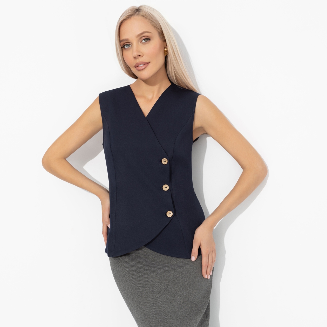 Жилет ЧАРУТТИ говорит о творческом подходе к деловому стилю. Асимметричные пуговицы добавляют современный и смелый акцент, нарушая традиционные правила офисного дресс-кода. Надень его поверх шелковой блузы, чтобы подчеркнуть талию и создать образ элегантной загадочности. Он идеально дополнит как классические брюки для встречи, так и юбку-миди для романтического ужина. Жилет в деловом стиле. Изделие приталенного силуэта укороченное. Асимметричное расположение пуговиц изделия.