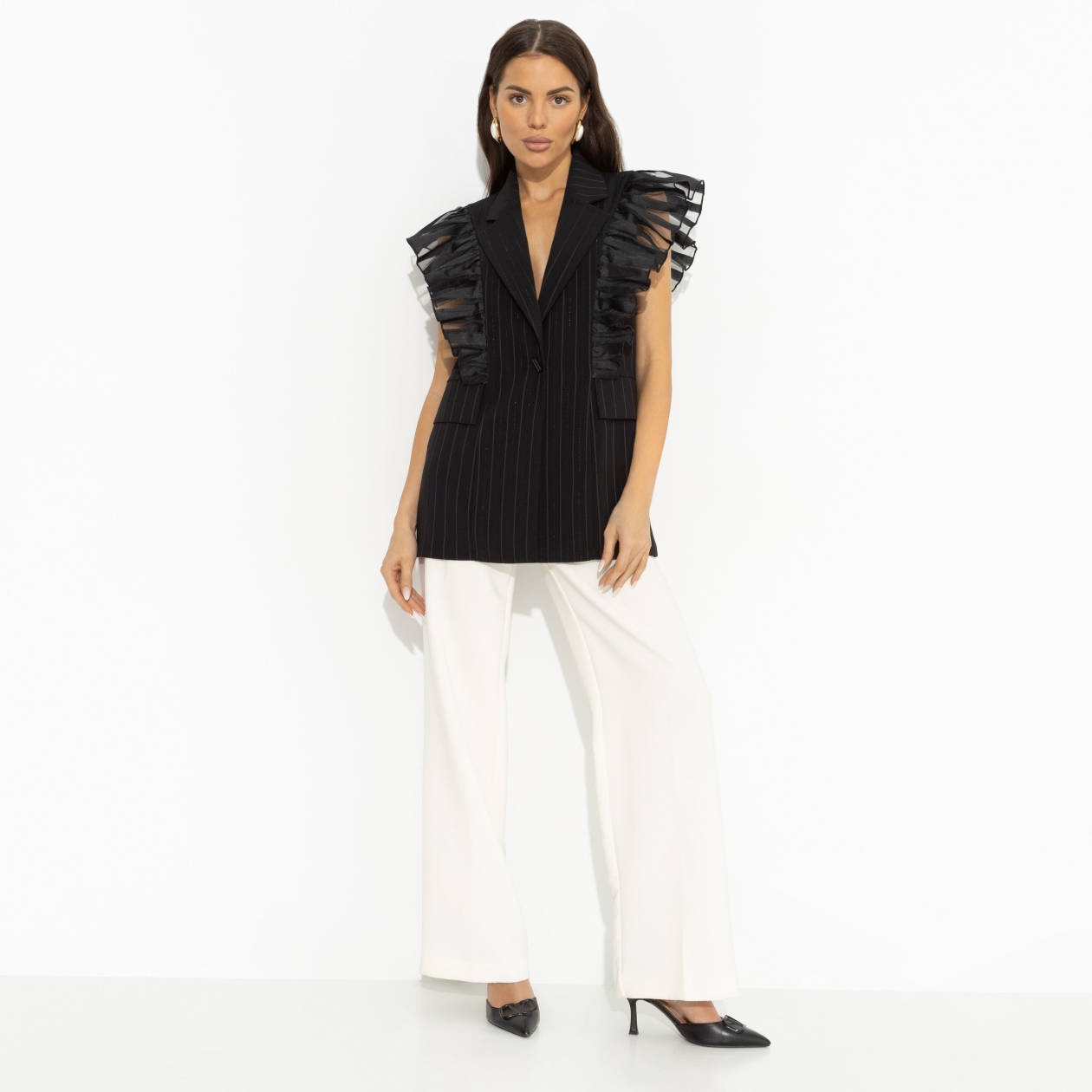 Вместо тысячи слов – один жилет. Вещь, которая поднимает бурные эмоции из глубин сознания и у тебя, и у него. Стиль, объем, интрига – всё здесь. Жилет носится, как праздник, который всегда с тобой. Жилет удлиненный, прямого силуэта. Однобортный, с лацканами. Застегивается на одну пуговицу. Есть объемный несъемный декор с двух сторон изделия. Имитация карманов. Изделие без подклада.