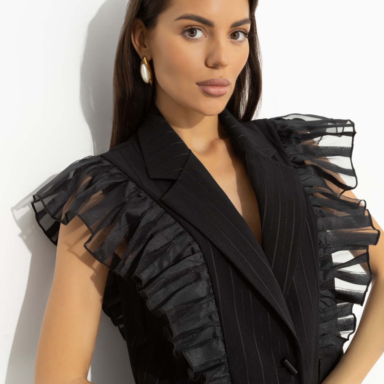 Жилет прямого кроя «Это восторг (black)» – это не просто одежда, это воплощение стиля и уверенности. В мире моды, где каждый элемент важен, этот жилет – настоящий шедевр. Женский жилет, выполненный из костюмной ткани «тиар», становится идеальным выбором для тех, кто ценит качество и элегантность. Удлиненный силуэт подчеркивает фигуру, а однобортный крой с лацканами добавляет нотки классической изысканности. Атмосфера праздника и торжества всегда будет с вами, ведь этот жилет – это нечто большее, чем просто одежда. Приобретая его оптом, вы получаете возможность дарить клиентам чувство уверенности и комфорта.