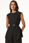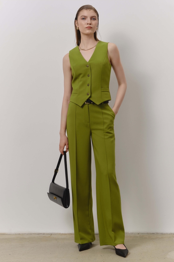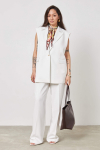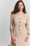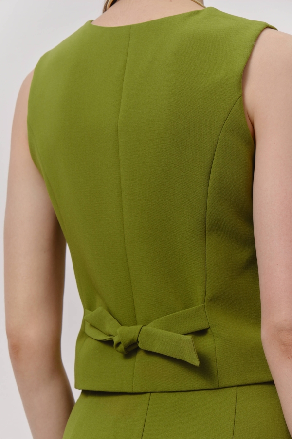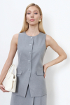 Жилет из костюмного полотна. Модель полуприлегающего силуэта с рельефами по переду, декоративной листочкой и фигурным низом. Застежка на пуговицы, на спинке хлястик с завязками.
