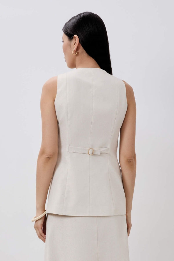 Жилет полуприлегающего силуэта из льна с напылением. По переду функциональная застежка на петли и акцентные пуговицы, имитация карманов с клапанами. По спинке рельефы.